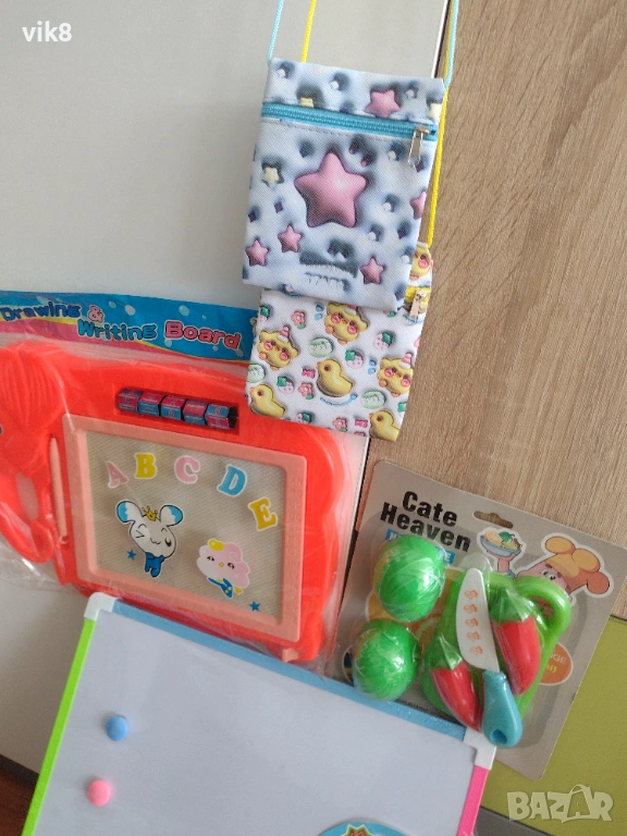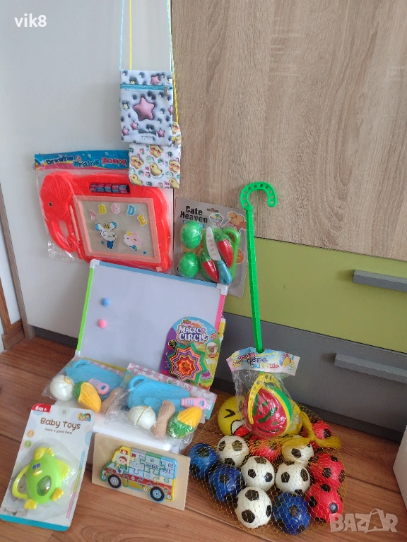 Цената е за всичките играчки.Топките са меки дунапренови.Пъзела е дървен.Дъската е с маркер и магнити.