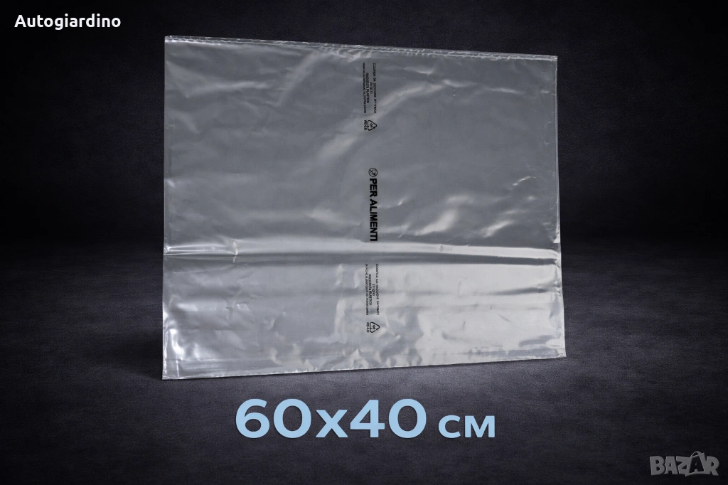 Практичен и здрав найлонов плик с размер 60 x 40 см, предназначен за съхранение и опаковане на различни продукти. Маркировката “PER ALIMENTI” показва, че пликът е подходящ за контакт с храни.