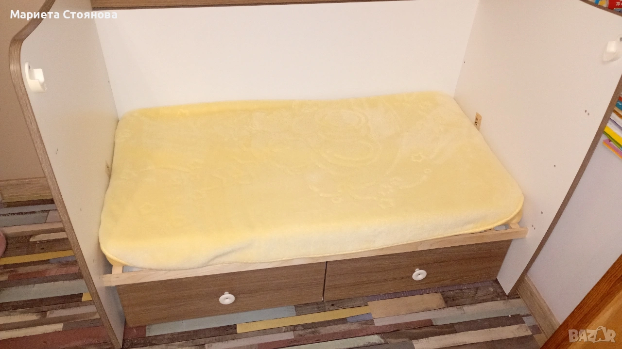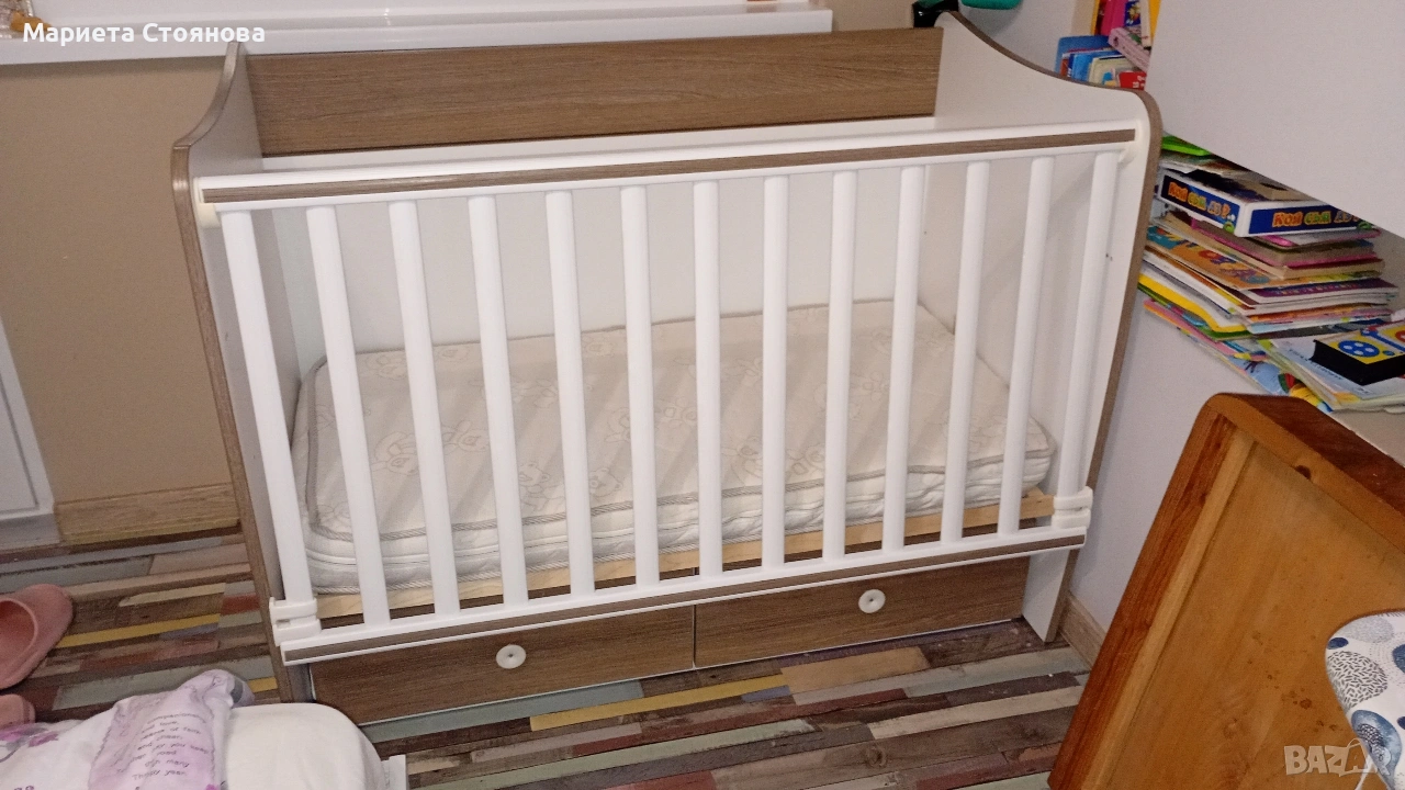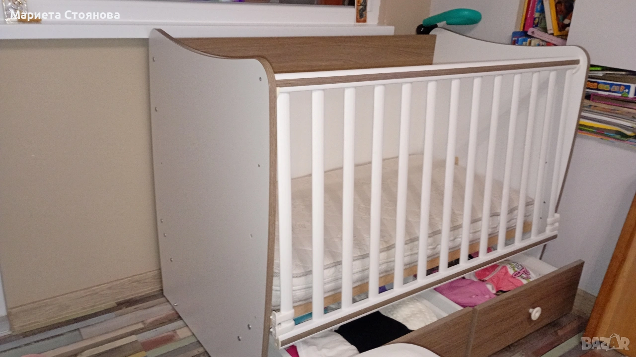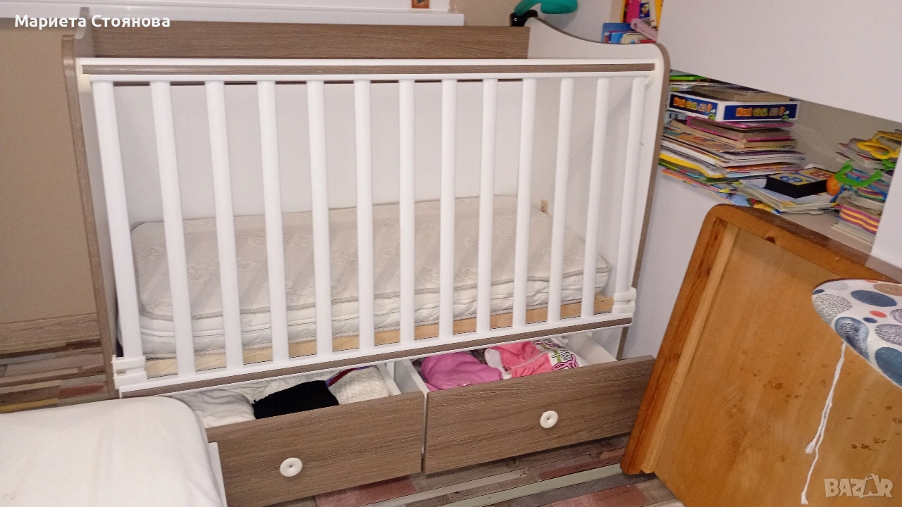 -Място за съхранение: В основата на леглото са разположени две големи чекмеджета, подходящи за бебешки принадлежности и аксесоари.