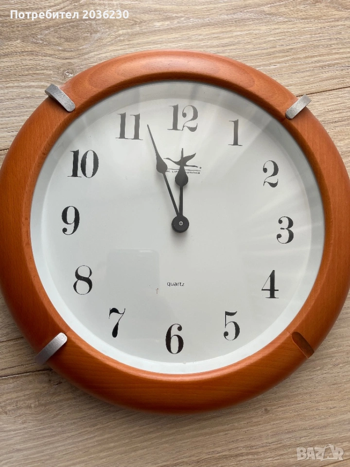 Стилен кварцов часовник с дървени елементи. Подходящ за стенен монтаж в дома или офиса.