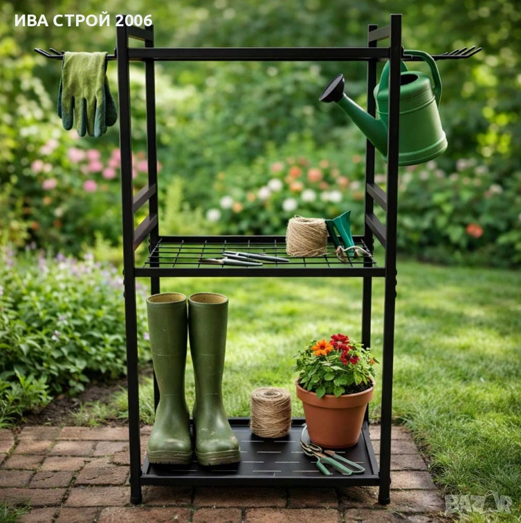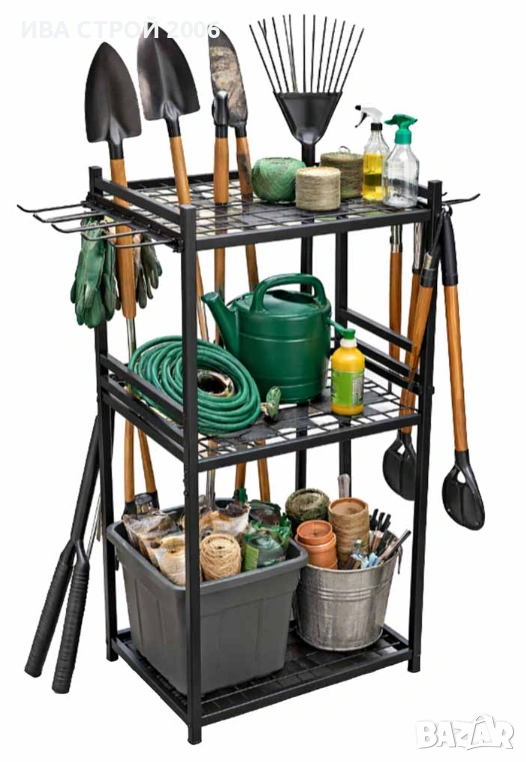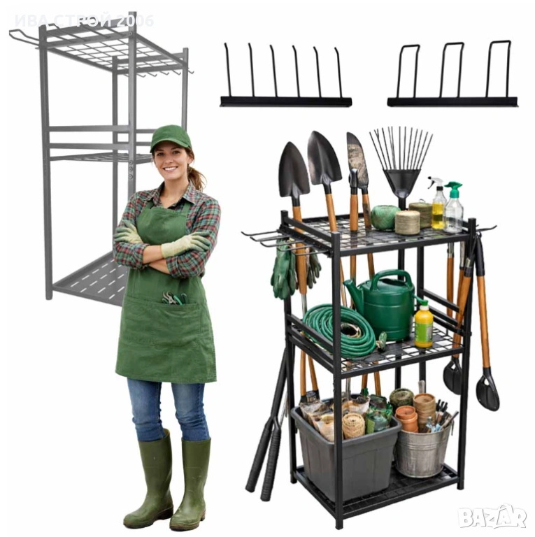 Практична стойка за градински инструменти, която осигурява подредба и лесен достъп до всички инструменти. Подходяща за градина, гараж или работилница, като спестява място и създава ред.