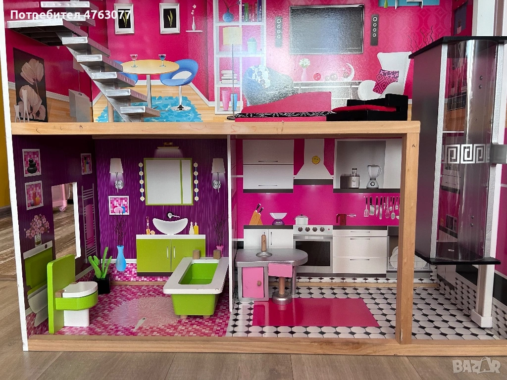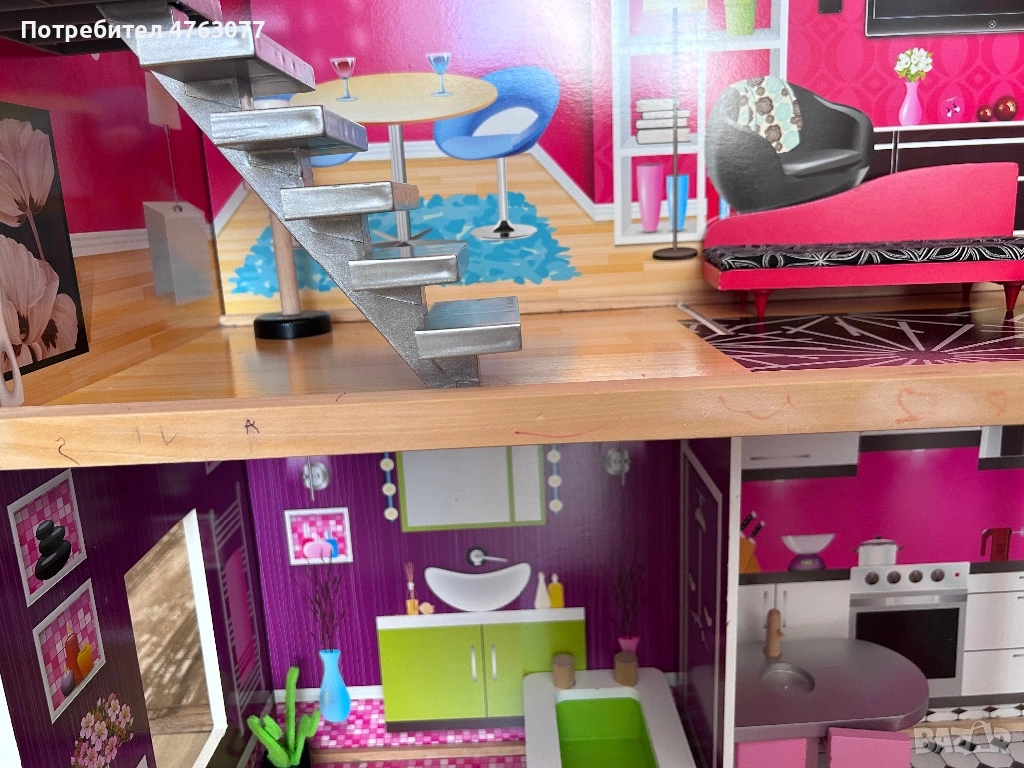 Къщата има след от игра- по рамката има малко надраскано с химикал и в банята на пода е леко скъсан тапета