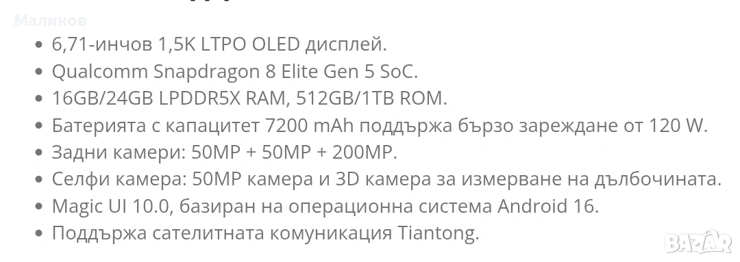 Китайска мултиезична версия, в разпвчатана кутия за инсталиране на Гугъл плей стор, с 2 години гаранция. Android 16, Magic OS. Пълни спецификации на модела може да разгледате на снимките. Комплектът включва зарядно с евро адаптер и гръб протектор (кейс). Цени както следва: