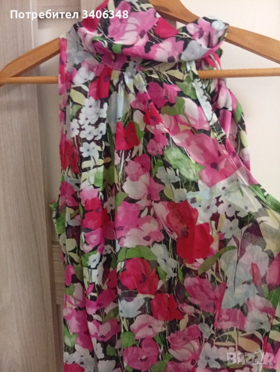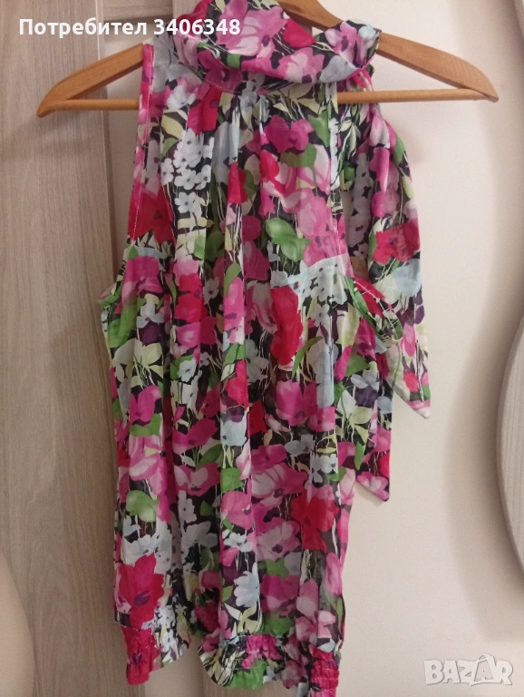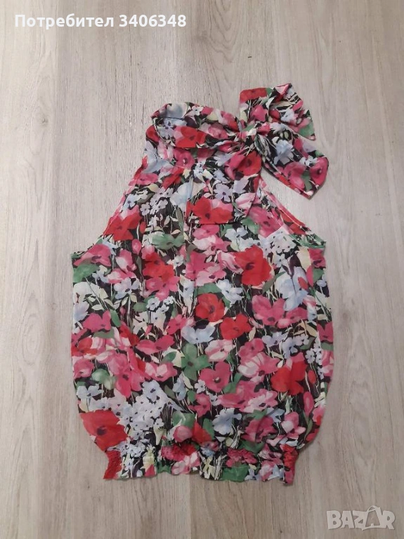 Флорална блуза без ръкав, шифон, много свеж и красив цвят. В долния край е с ластик и може да се регулира дължината. На шията се вързва и може да се носи по различен начин. Гръдна 104, дължина 60 см. Не е носена!