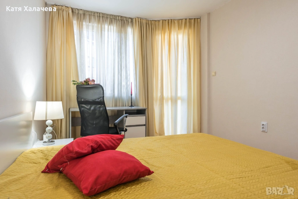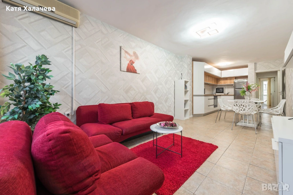 На площ от 100 кв.м са разположени: просторна дневна с тераса, две спални - едната с двойно, другата с двойни и/или две единични легла, обща тераса, баня с душ кабина и тоалетна, антре, 1 климатик в дневната.