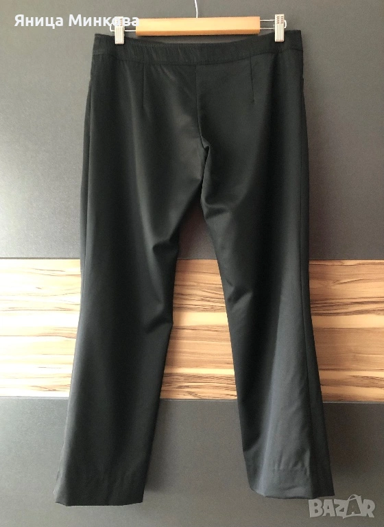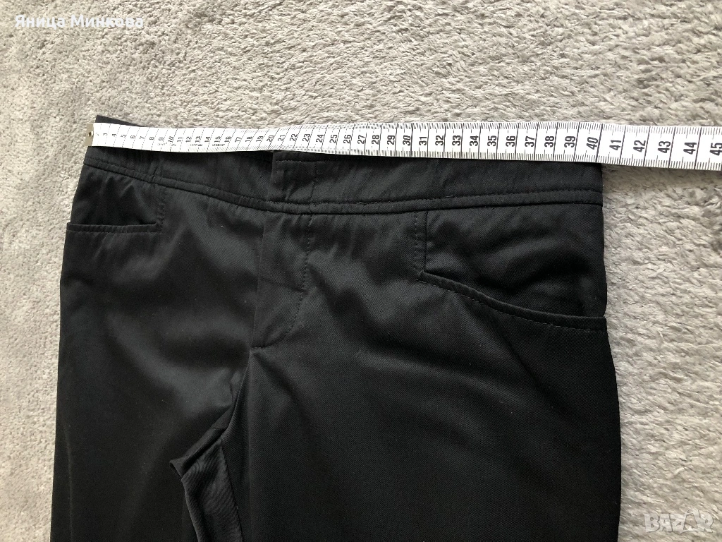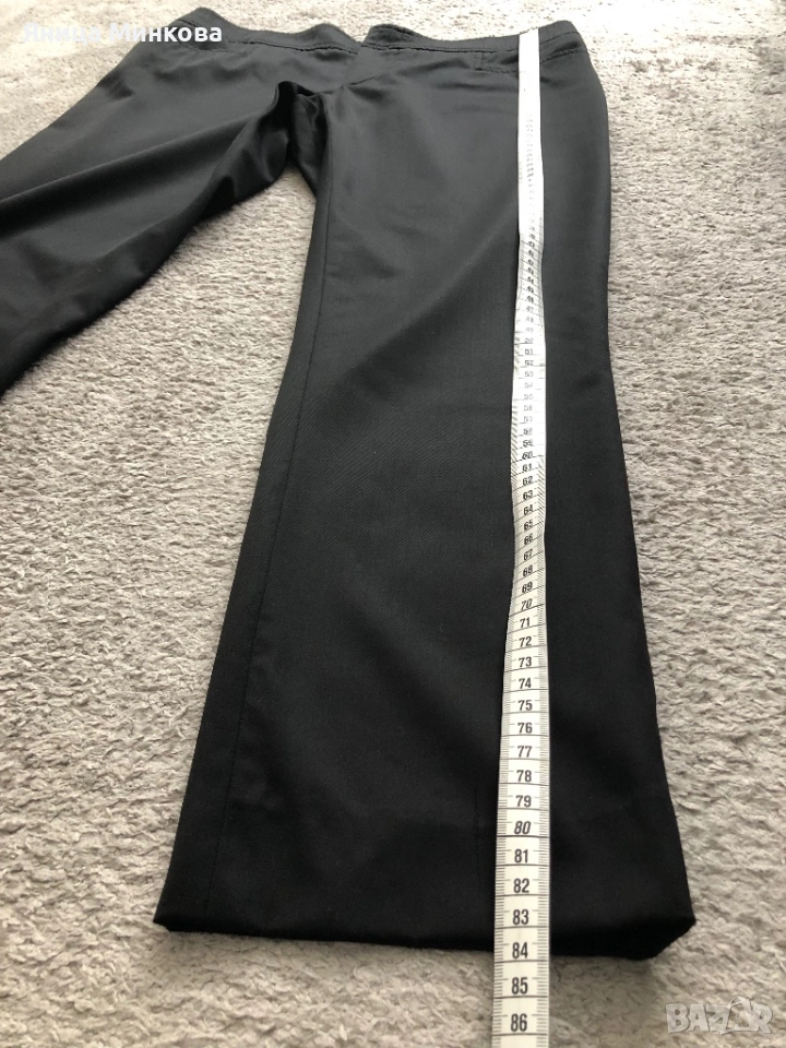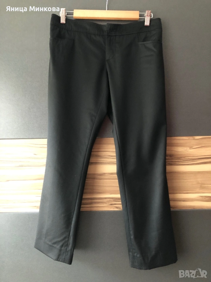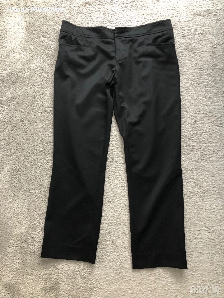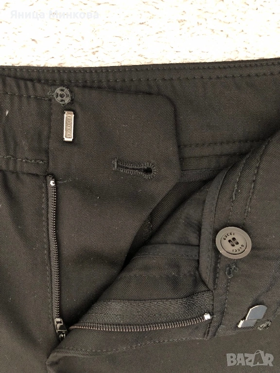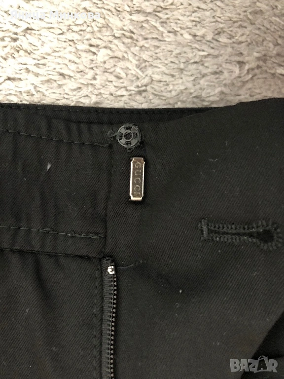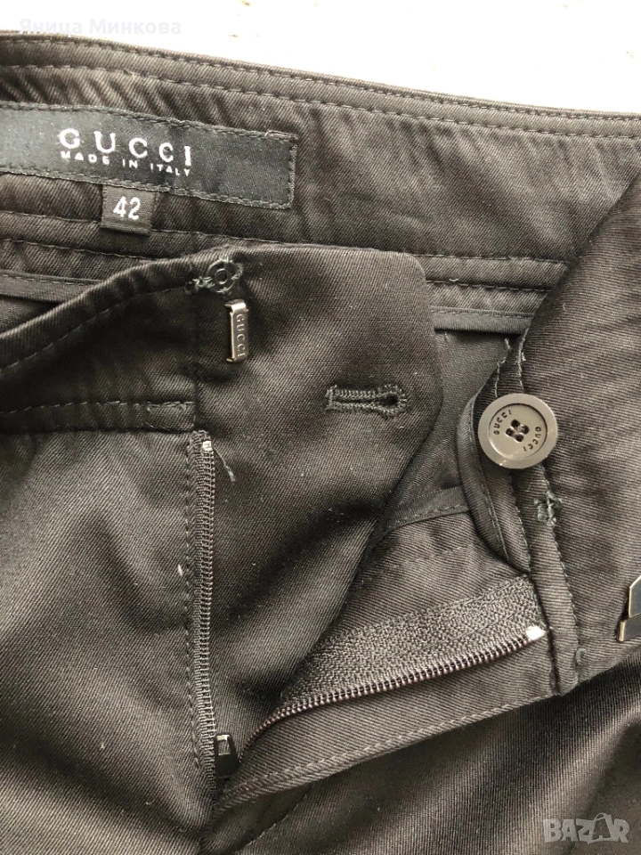 Gucci. Панталонът е изработен от плътна гладка материя и разполага със скрито закопчаване с кукичка и цип, което му придава изчистен и елегантен вид. Панталонът е в размер 42 (италианска номерация), което съответства на европейски размер S. Има лека забележка, която съм показала на последната снимка. Размери: