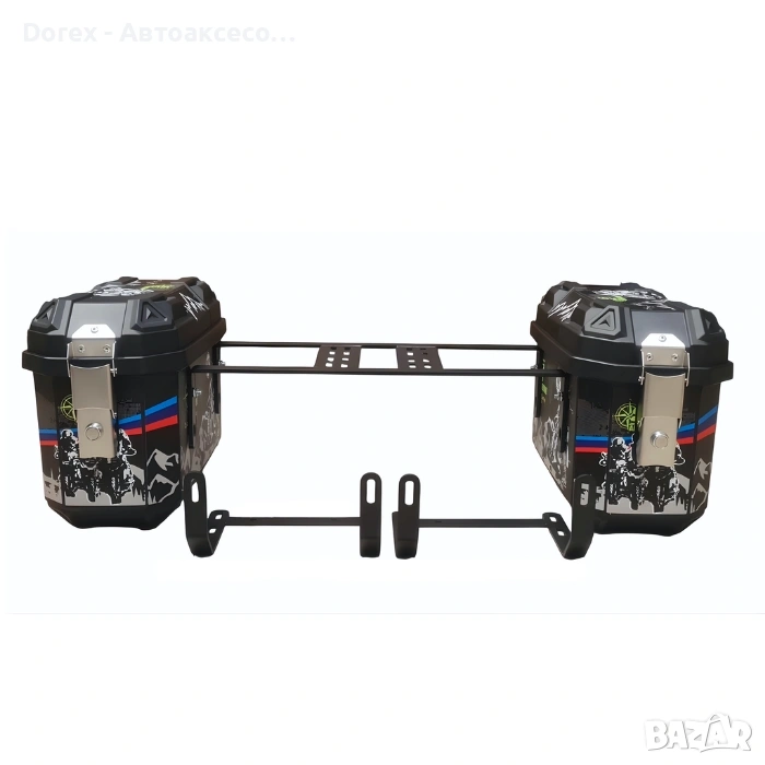 Комплектът включва 2 броя странични куфари с обща вместимост от 45 литра, осигуряващи достатъчно място за личен багаж, инструменти или къмпинг оборудване. Изработени от висококачествен PP материал, те са устойчиви на удари, надраскване и неблагоприятни атмосферни условия.