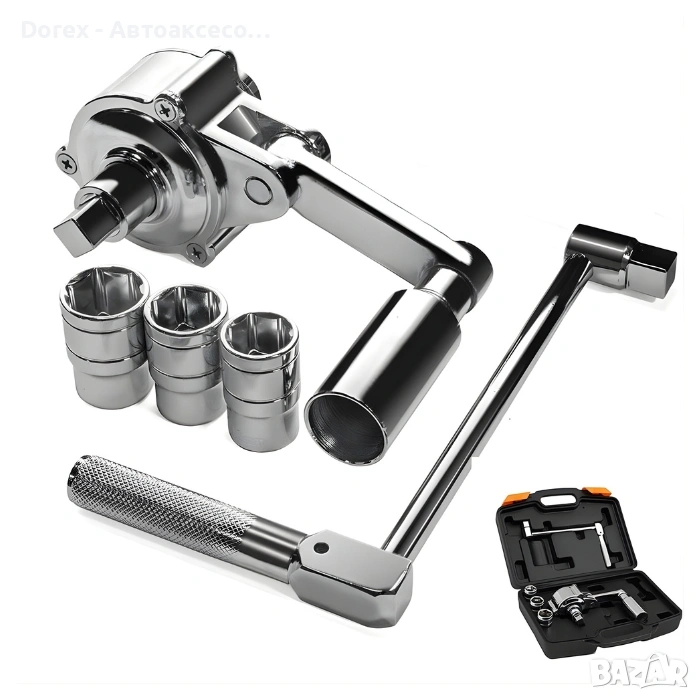 Комплектът включва всичко необходимо за работа – механичен гайковерт, ръкохватка, три вложки (17 мм, 19 мм и 21 мм) и удобен куфар за съхранение.