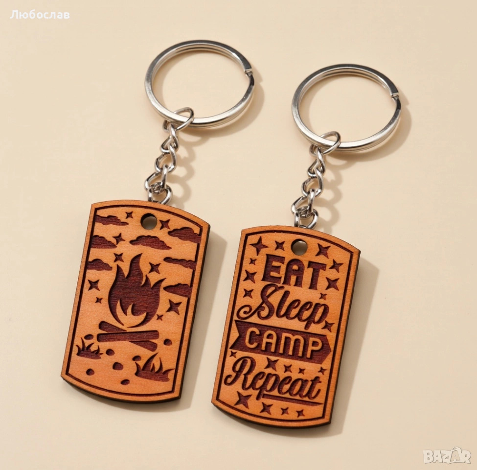 комплект от два красиви дървени ключодържателя с къмпинг тематика – идеалният подарък за всеки любител на приключения, палатки, огън и нощувки сред природата!