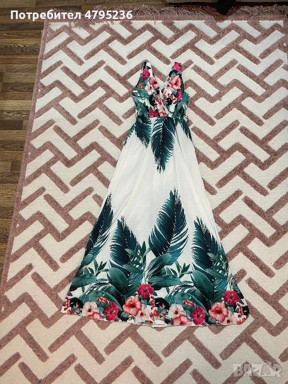 • Детайли: Свежа бяла макси рокля с красив принт на палмови листа и цветове от хибискус. Идеална за морето.