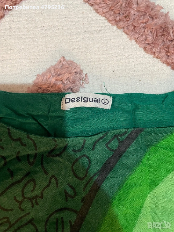 • Арт рокля Desigual (Зелена с надписи): Оригинален дизайн с типичните за марката принтове. Изключително мека материя.