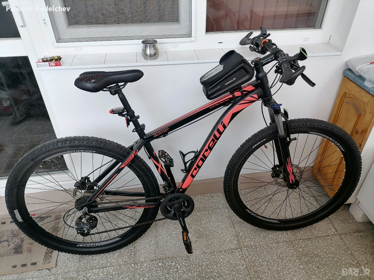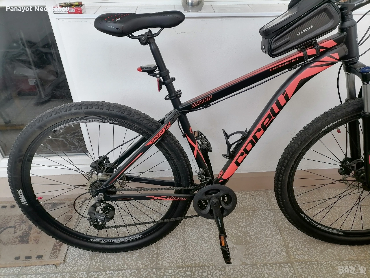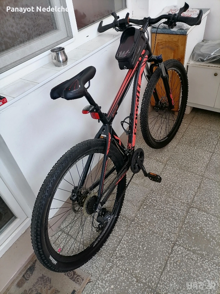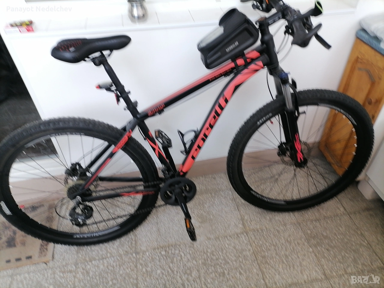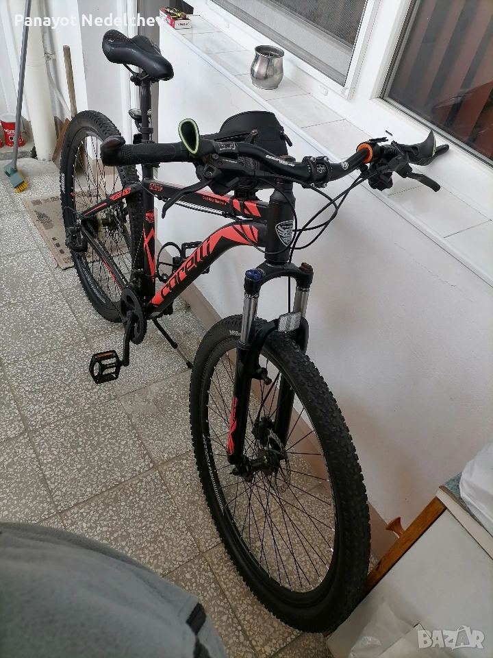 Велосипеда е като нов. Дискови спирачки. Каран е 5 пъти до Солниците. Плюс резервна външна гума. Плюс много други неща. Сменена силиконова седалка, Бар за телефон и зарядно, преден и заден соларен фар, алуминиеви капачки за вентили, рогови ръкохватки,. алуминиеви педали с гумички, настройки на предно, задно и средно движение, стойка за бутилка и бутилка 800 милилитра, предни амортисьори с превключвател, 21 скорости. И допълнителни рога на кормилото. Велосипеда е много добър.