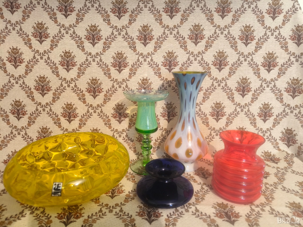 Лот изящни стъклени предмети от цветно стъкло, всичките произведени в края на 80-те години на ХХ в. в КПС "Китка" Нови пазар. Стъклариите са здрави, стояли във витрина. Два свещника, две вази и една голяма фруктиера. Цената е обща за всичко от снимката, предметите не се делят.