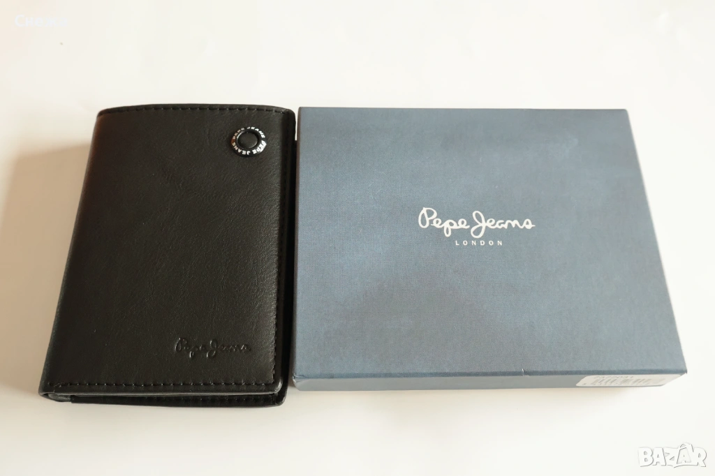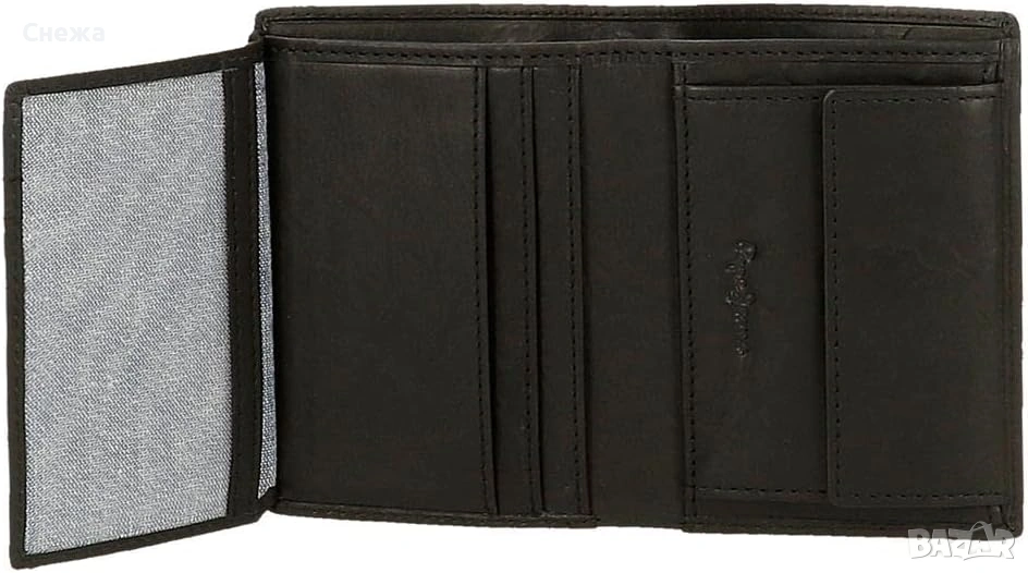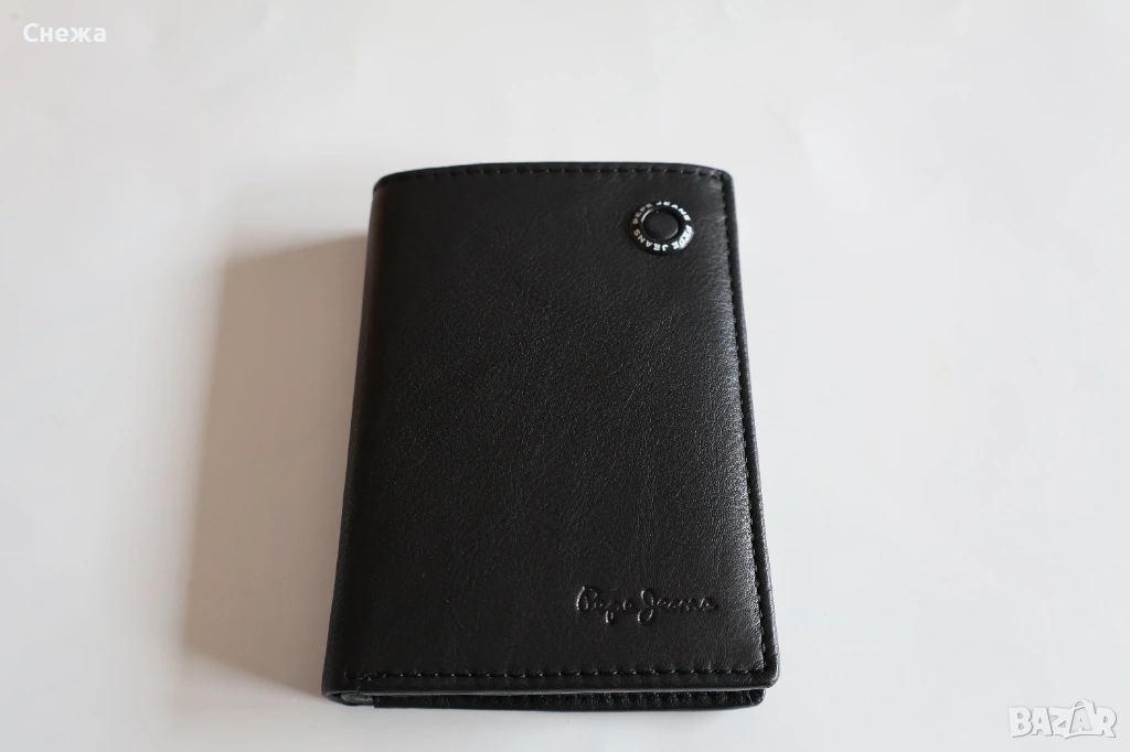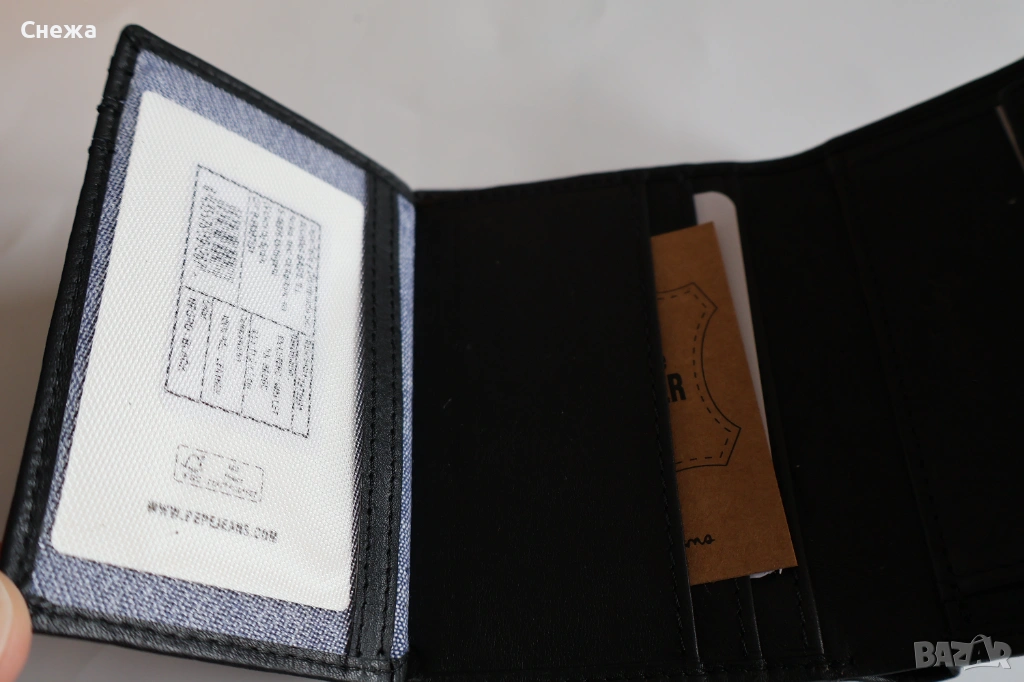 от вътрешната страна. Лого отпред на портфейла и надпис на фирмата отпред и от