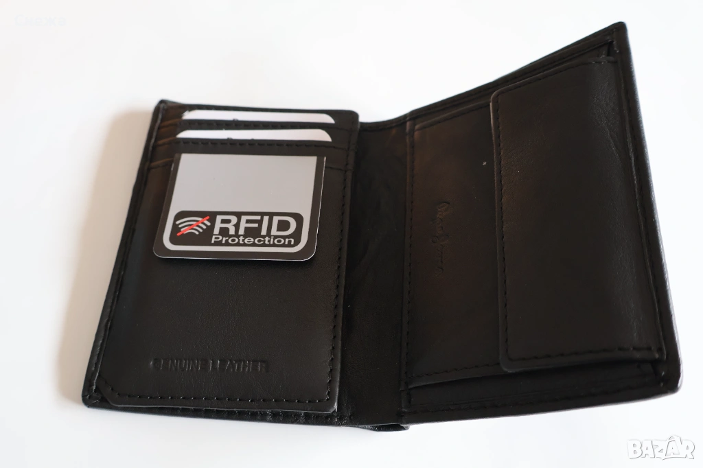 безконтактните карти. Изработен е изцяло от черна естествена кожаи подплата от плат