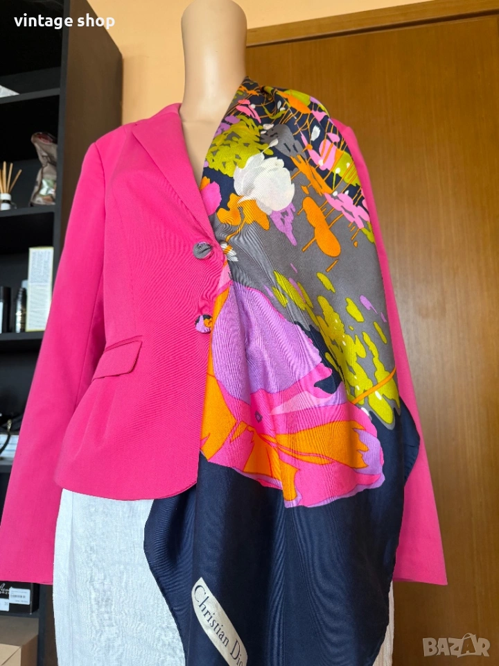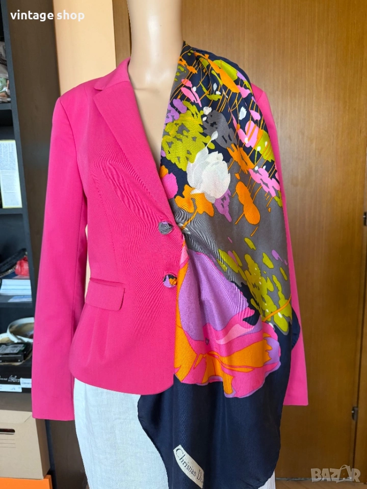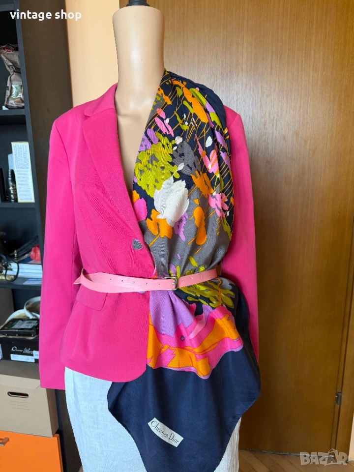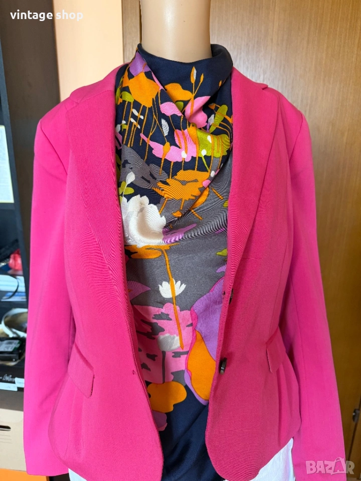 Пъстрите цветове позволяват да се съчетае с много цветови комбинациии като в случая съм избрала сако в циклама, на фона на който шалът се откроява силно.