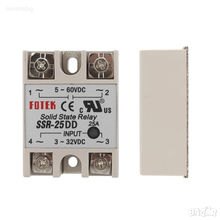 Еднофазно твърдотелно (полупроводниково) реле Fotek SSR-25DD. За разлика от стандартните електромагнитни релета, твърдотелните релета (SSR) нямат движещи се части, което ги прави по-издръжливи, безшумни и бързи при превключване.