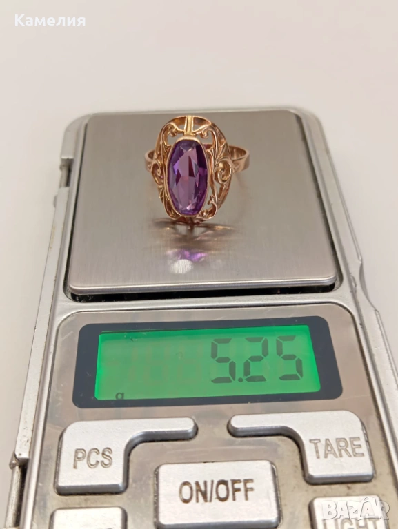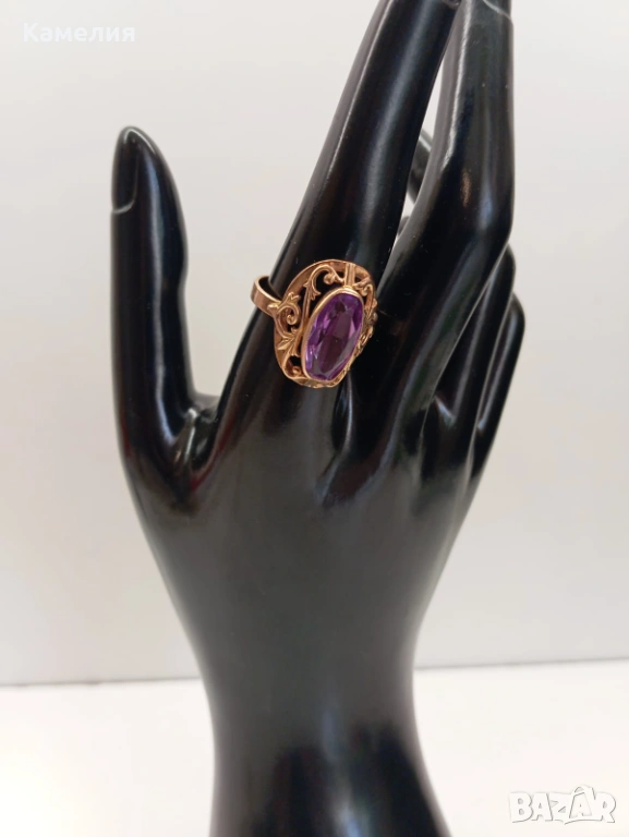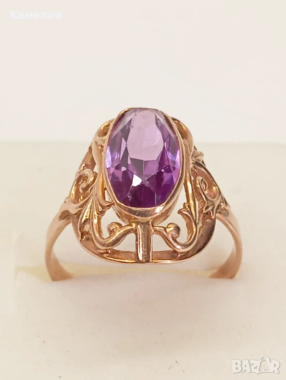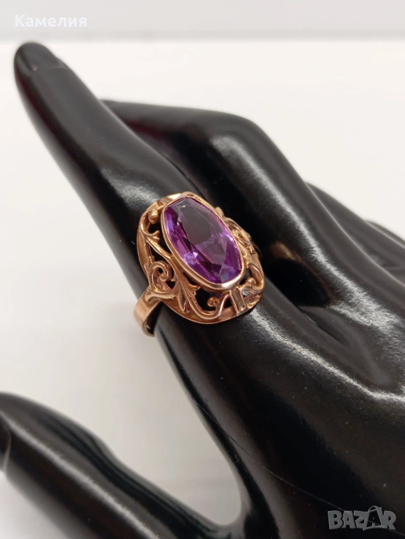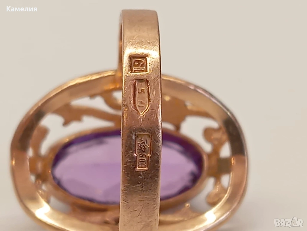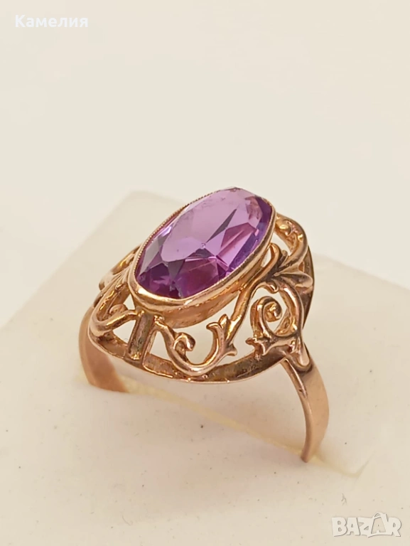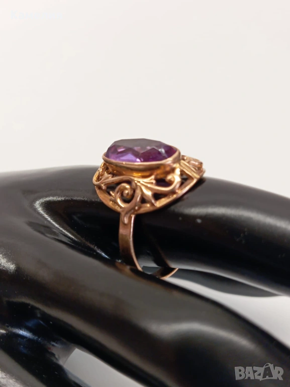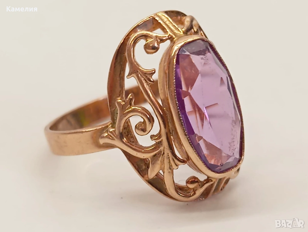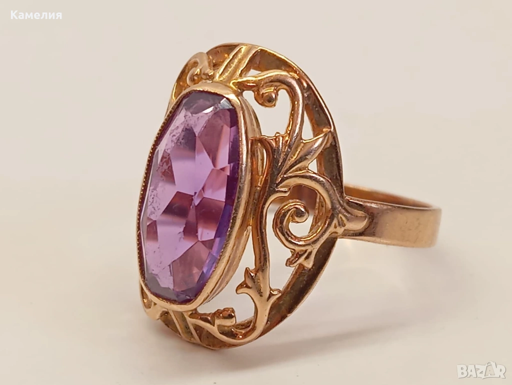 Руски (съветски) златен винтидж масивен пръстен. Проба звезда 583. Грамаж 5,25 грам. Диаметър 19,5 мм. Лабораторен аметист. Върху камъка има микро точици, невъоръжен поглед не се вижда.