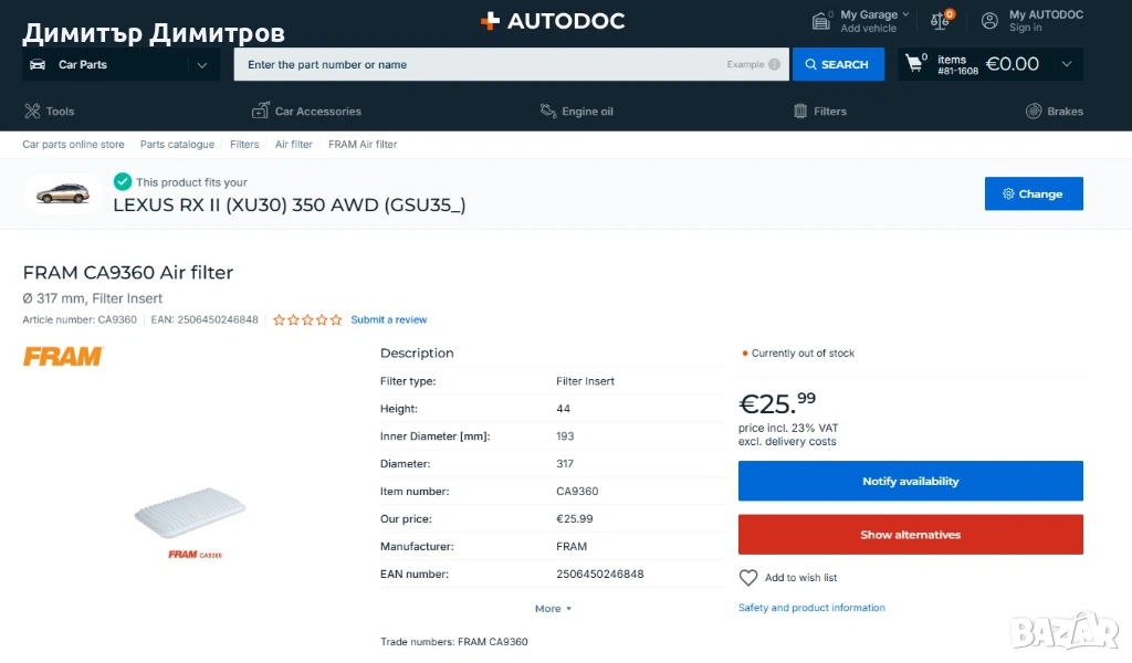 въздушен филтър LEXUS RX350 до 2008 → Обява 54181941