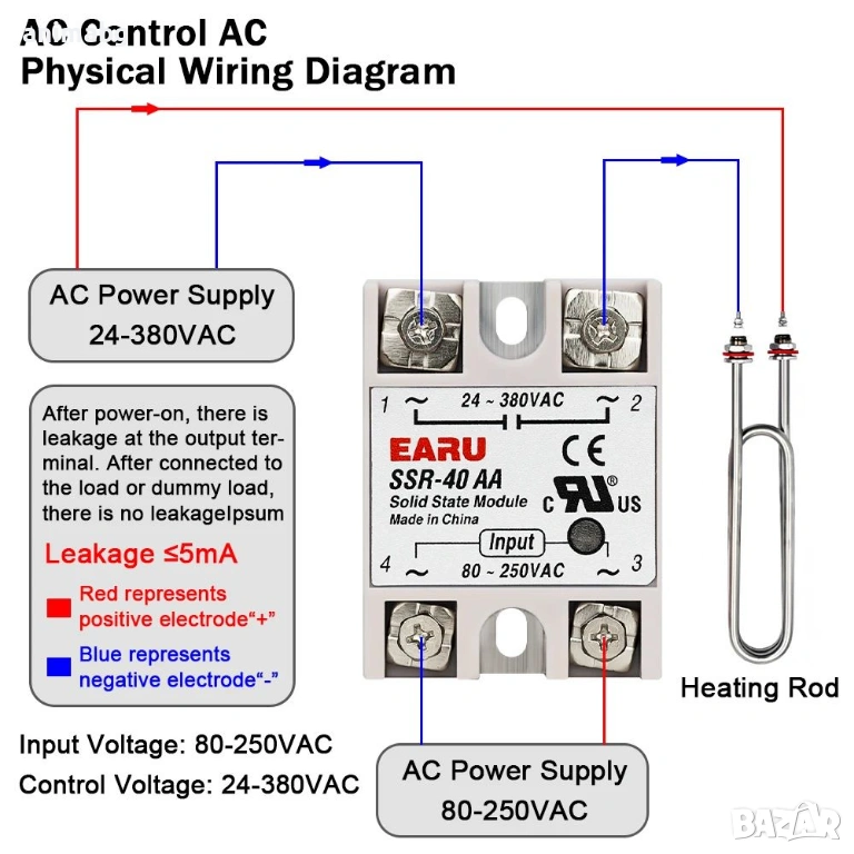 • Управляващо напрежение (Input): 80 ~ 250V AC (клеми 3 и 4)