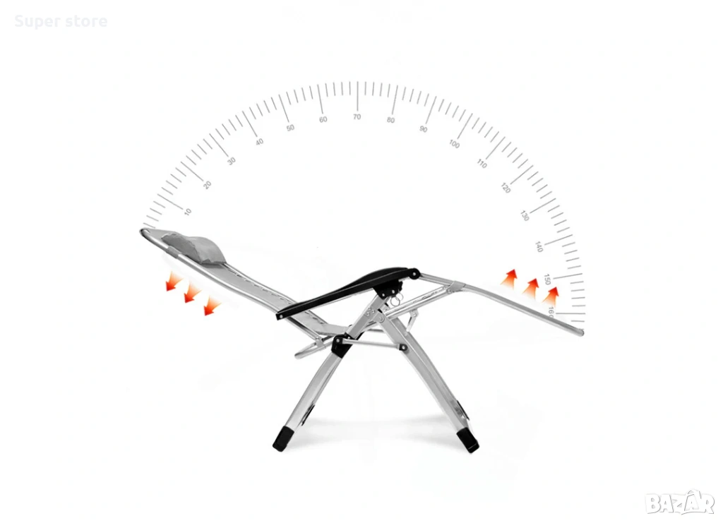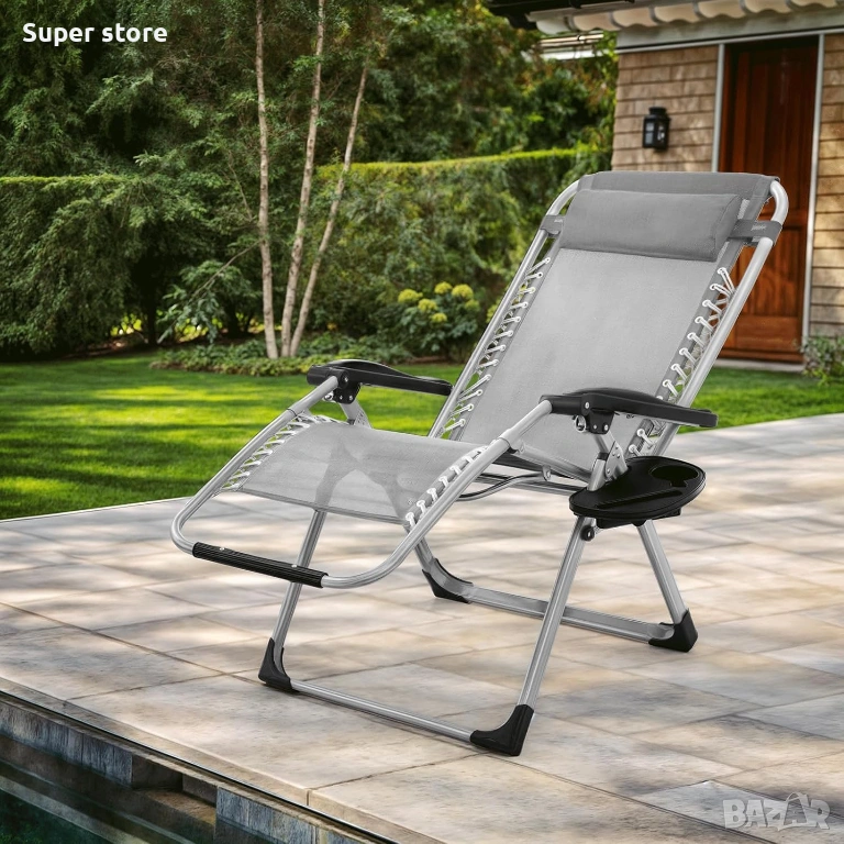 Включената мека възглавница поддържа главата и врата, а удобната поставка за чаша добавя практичност при използване. Здравата метална рамка осигурява стабилност и издръжливост, а сгъваемият дизайн позволява лесно съхранение и пренасяне.