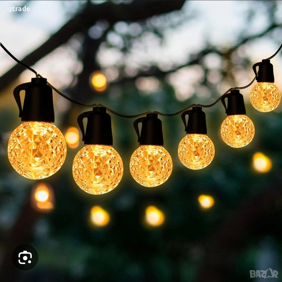 По данните от продукта и снимките гирляндата е с IP65 водоустойчивост, подходяща за външна и вътрешна употреба. Крушките са G40 тип и са shatterproof, което означава по-устойчиви и по-практични за ежедневна употреба. Светлината е топла и създава много приятна атмосфера за тераси, дворове, заведения, празници и различни събития.