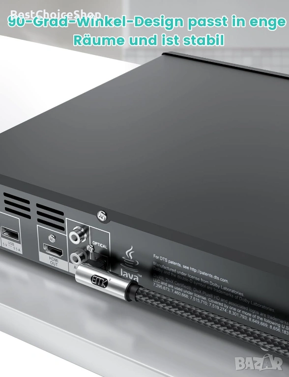- [Дизайн, пестящ място] Уникалният дизайн под 90 градуса прави оптичния аудио кабел идеален за устройства, монтирани на стена, и решава проблема с ограниченото пространство между стената и устройството.