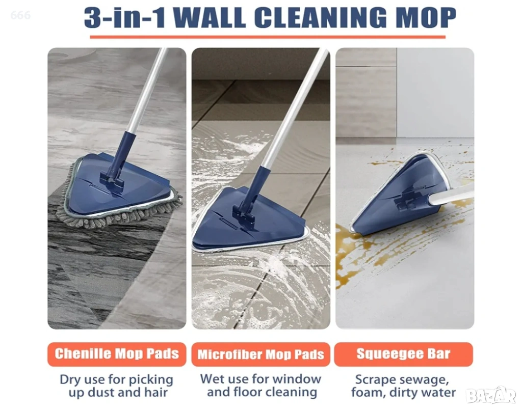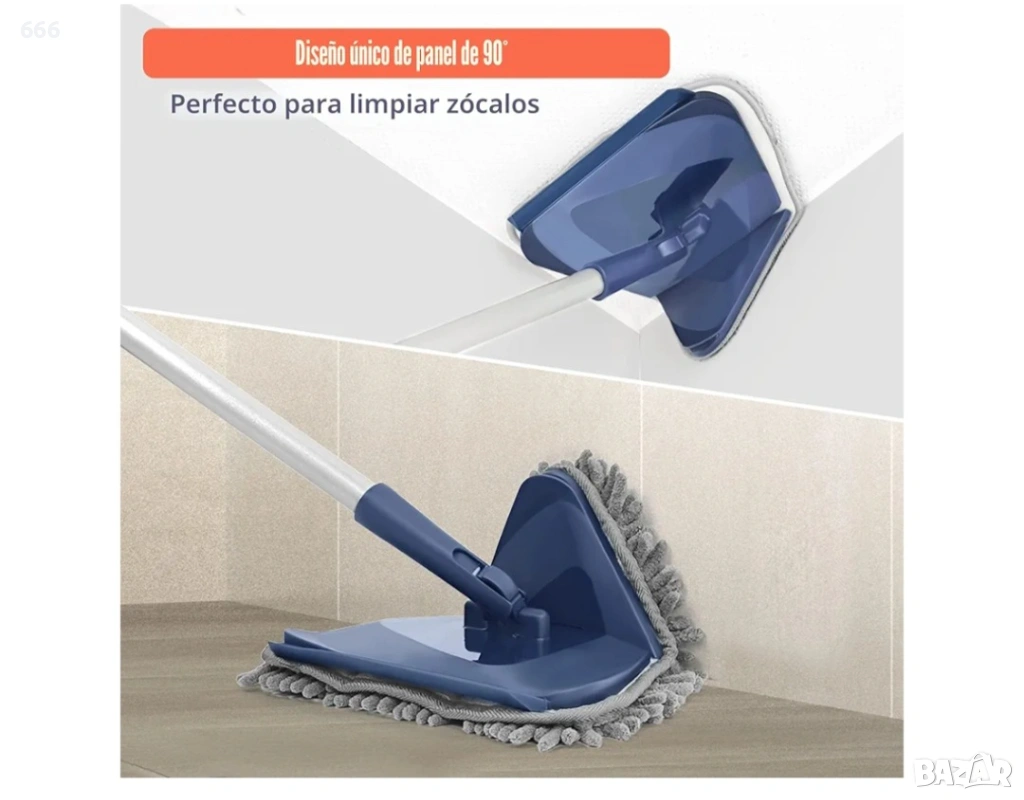 Ефективно почистване на первази: Този моп за почистване на стени е оборудван със сгъваем на 90° панел, който е идеален за почистване на первази. Подложката за моп от шенил може ефективно да събира прах, коса или малки отпадъци.