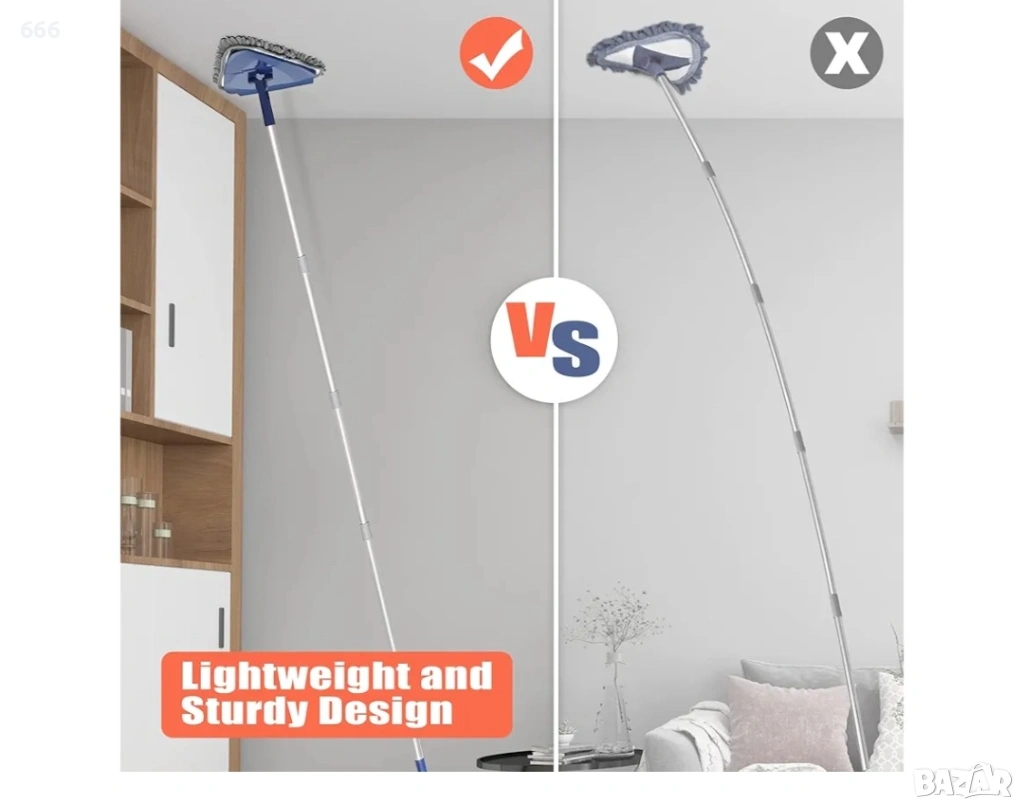 Почистете старателно ъглите: Въртящата се на 360 градуса глава на този моп за стенен прах може гъвкаво да достигне ъгли, дъна или други тесни пространства. Не е нужно да се притеснявате, че мопът ще се разхлаби или ще се преобърне.