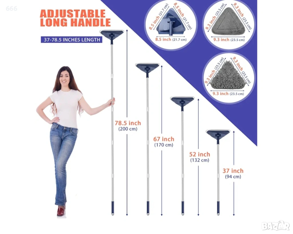6 мопа за мокро и сухо почистване: Този триъгълен комплект мопове съдържа 3 микрофибърни мопа и 3 мопа от шенил. Микрофибърните мопове могат да се използват мокри за почистване на подове и прозорци; моповете от шенил могат да се използват сухи за бърсане на прах и премахване на паяжина.