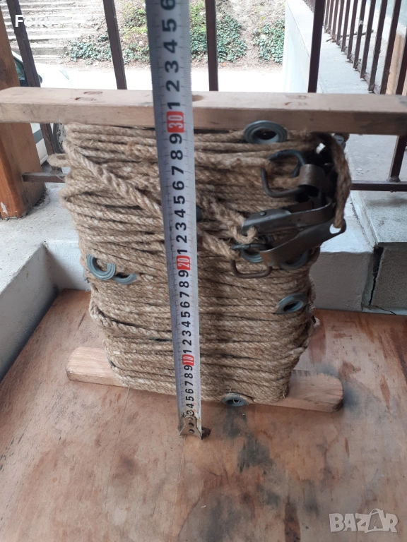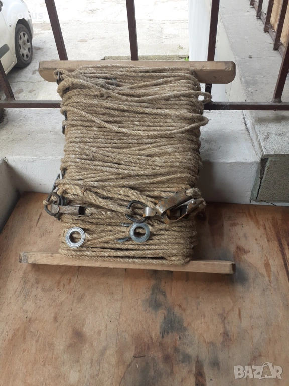 Старо военно сапьорско конопено въже с халки и карабинки → Обява 54183125