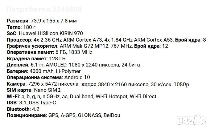 Телефона е като нов, тъй като месец след като го имах си купих следващия тогава модел на марката - HUAWEI P30 Pro и този когото продавам ми остана като резервен телефон и не е ползван. Наскоро си купих и Samsung S25 Ultra и вече имам 2 резервни телефона. Ето защо продавам обявения в обявата HUAWEI P20 Pro. Като Нов - Без нито една драскотинка, където и да е. Пълен комплект с оригинално зарядно, кутия, слушалки. Батерията в телефона си е оригиналната и се държи великолепно – при нормално ползване до 2-3 дни. Добавям и чисто нова оригинална батерия, като подарък. Същата не се наложи да я поставям в телефона. Оставям това на новия собственик, когато прецени да го направи.