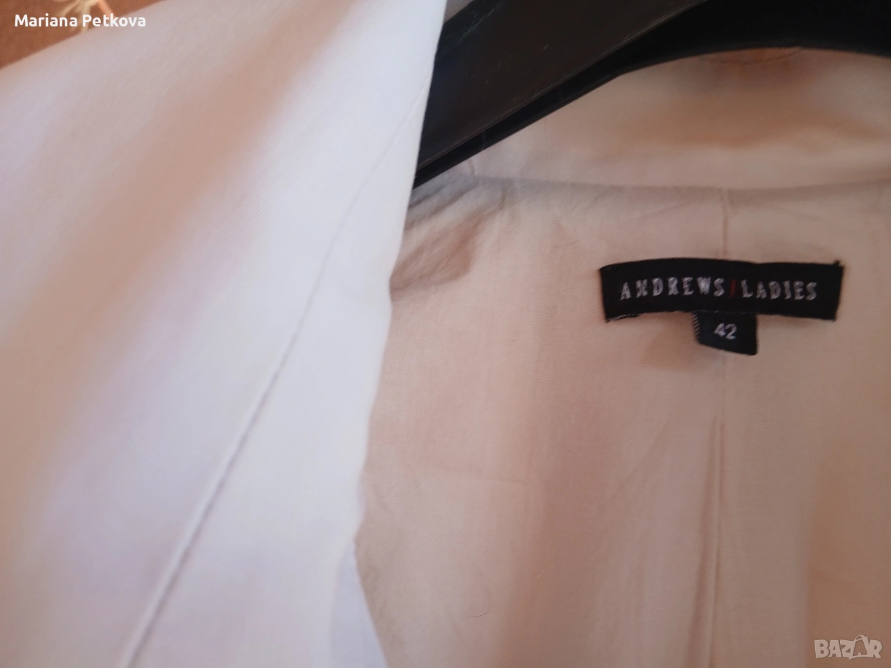 Продавам бял, марков дамски шлифер. Дрехата е вталена, марка "Andrew's Ladies". Дължина 98 см, ръкав 60 см, гръдна обиколка 90см.