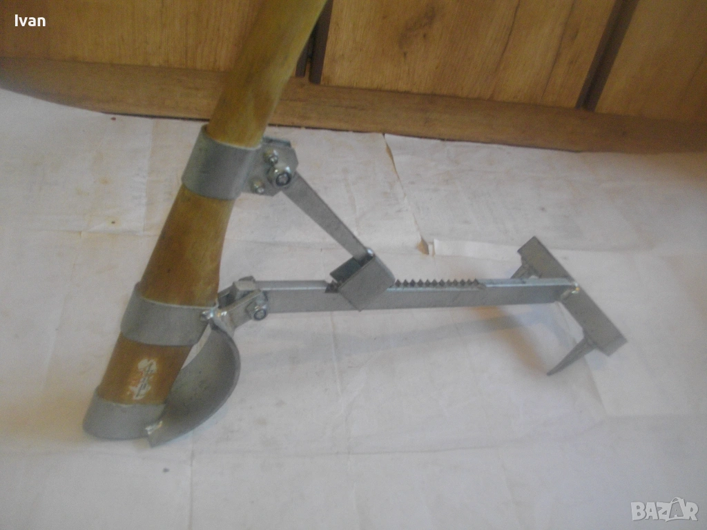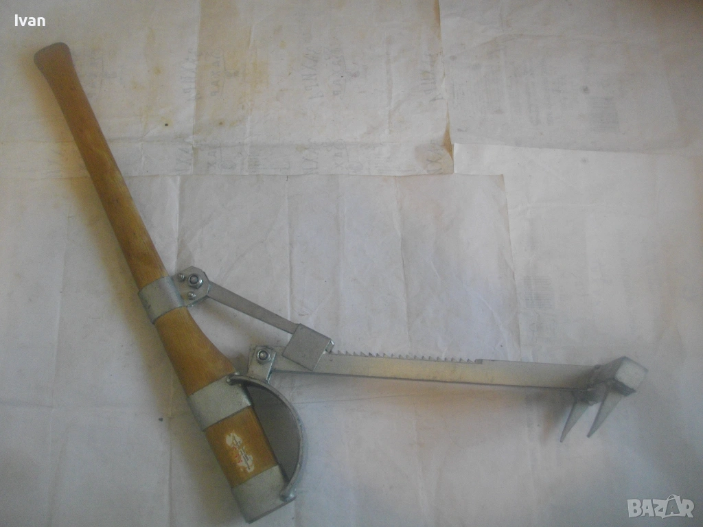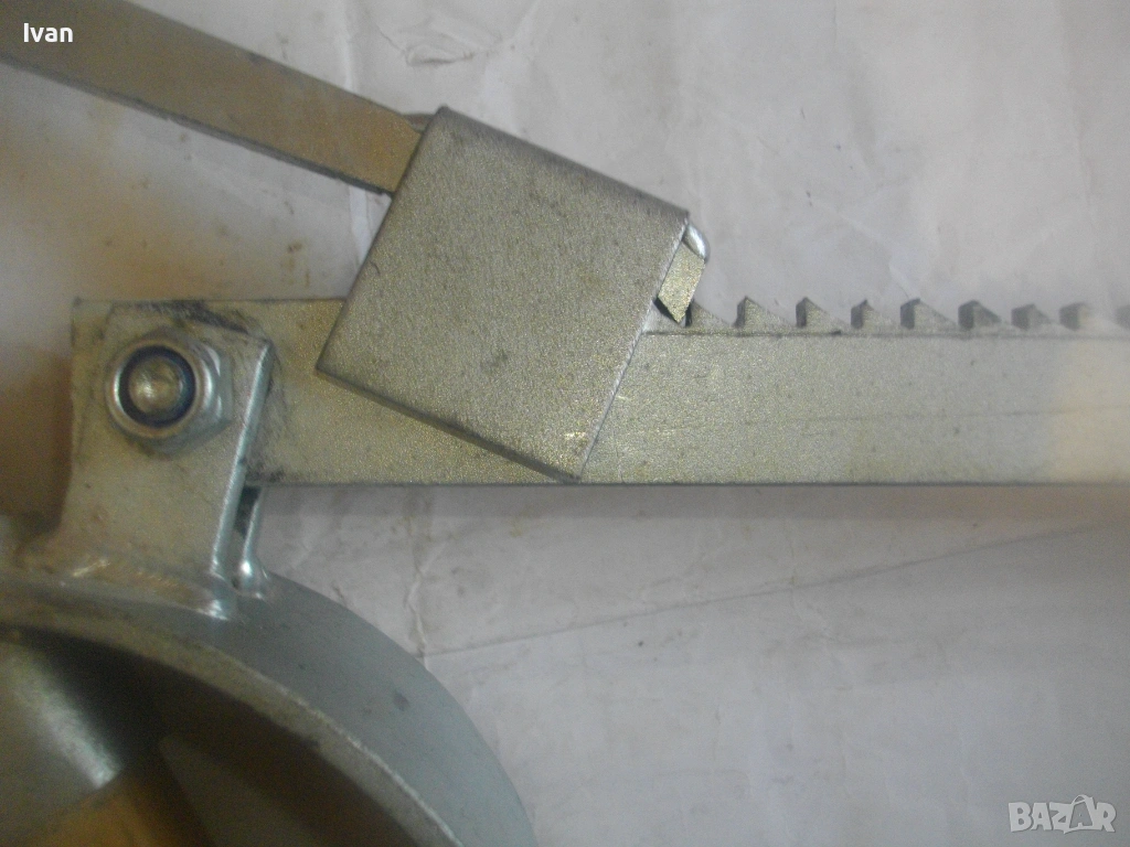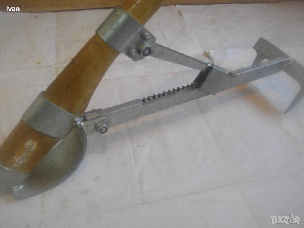 Дървен сап лост масивен с дължина 67 см, подвигащ и обръщащ трупата метален механизъм със зъбни стопери застопоряване под желан определен ъгъл. Металната част на устройството под дървения лост е с дължина 58 см, следва широка част метална 18 см, на която са разположени 2 броя метални масивни зъби с дължина по 6 см, с които се захващат трупите.