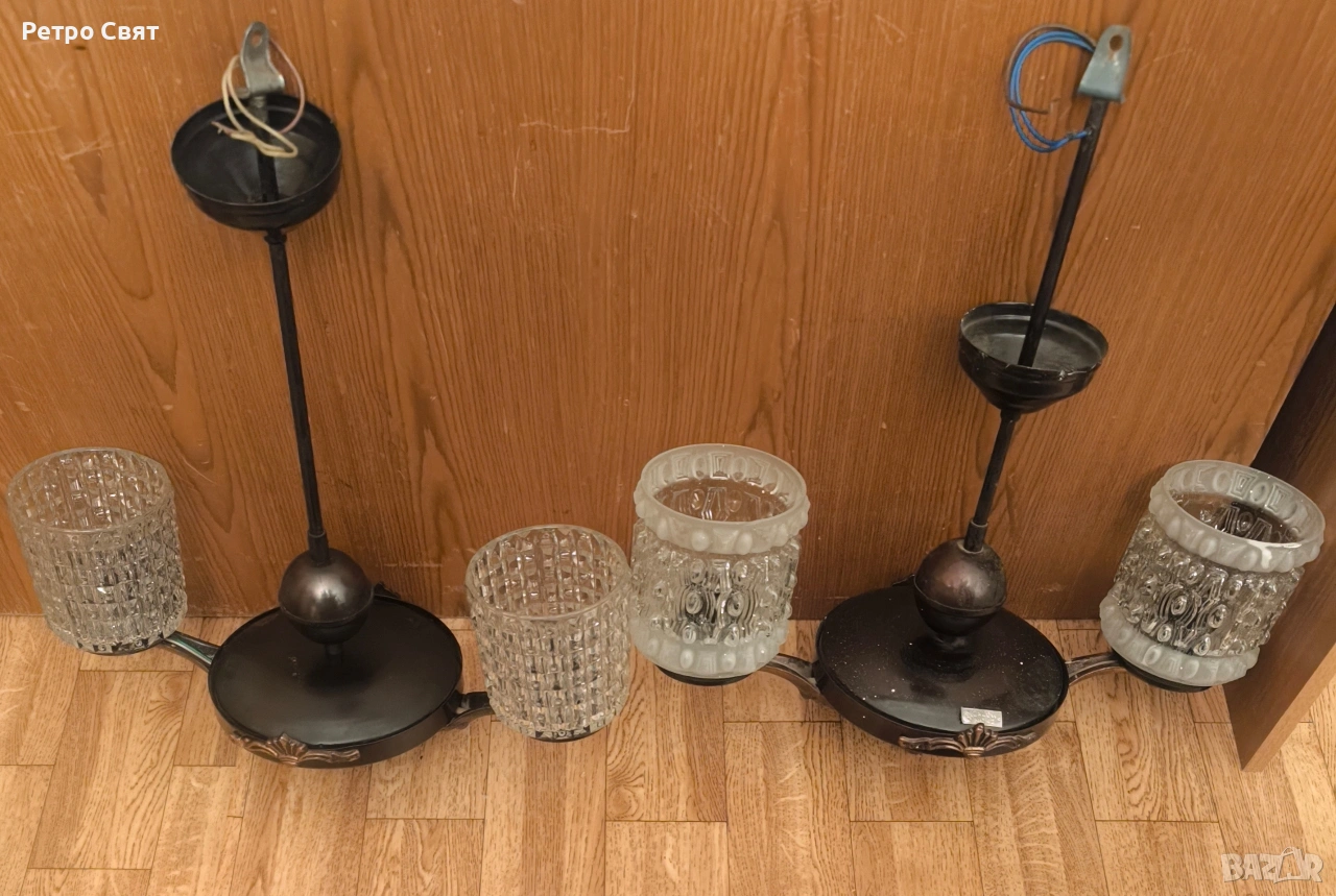 Комплект от два медни румънски полилея с по две гнезда с цокъл Е 27. Полилеите са свалени на скоро, работещи са, имат нужда от леко почистване. Леки следи от употреба, но в много добро състояние за годините си. Цената е обща за двата. Не се делят. Изпращам с куриер по избор, опаковам за моя сметка.