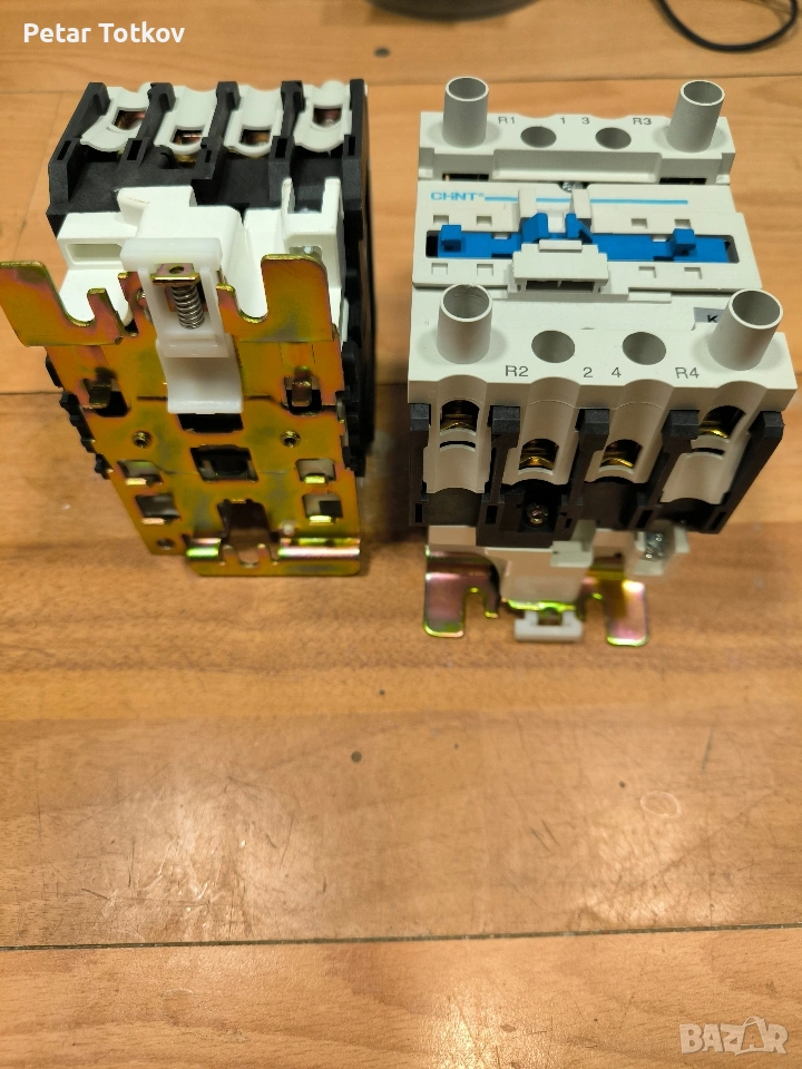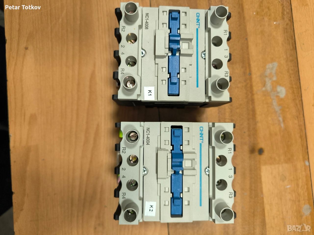 На изображението са показани два контактора CHINT от серията NC1, Това е променливотоков (AC) контактор от серията CHINT NC1, модел NC1-4008. Използва се основно за дистанционно включване и изключване на електрически вериги и управление на променливотокови двигатели. Основни технически характеристики на модел NC1-4008: Брой полюси: 4 основни полюса (в конфигурация 2NO + 2NC, т.е. 2 нормално отворени и 2 нормално затворени контакта). Номинален работен ток: При категория AC-3 (индуктивни товари като двигатели): 40A. При категория AC-1 (активни товари като нагреватели): 60A. Мощност на управлявания двигател: Обикновено се използва за товари до 18.5 kW (при 380/400V). Номинално напрежение на веригата: До 690V AC. Управляващо напрежение на бобината: Моделите от серията се предлагат с различни бобини (например 24V, 110V, 230V, 400V), като конкретното напрежение за вашето устройство обикновено е отбелязано отстрани на корпуса или върху самата бобина. Приложение Този тип контактори са често срещани в индустриални и търговски електрически табла за управление на помпи, компресори, конвейери и осветителни системи. Може да проверите актуални цени и наличности при доставчици като Homefinishing или Кабелкомерс за подобни модели от серията. Цена: Единичната цена за модел NC1-4008 е около 122,83 лв. (без ДДС). Малко работили,почти като нови.Цената е за двата.