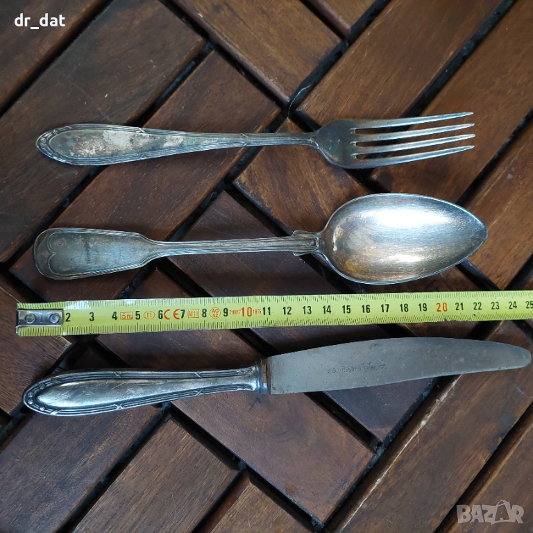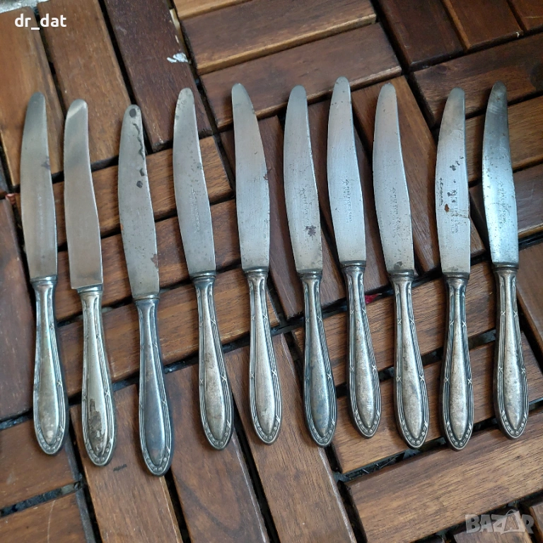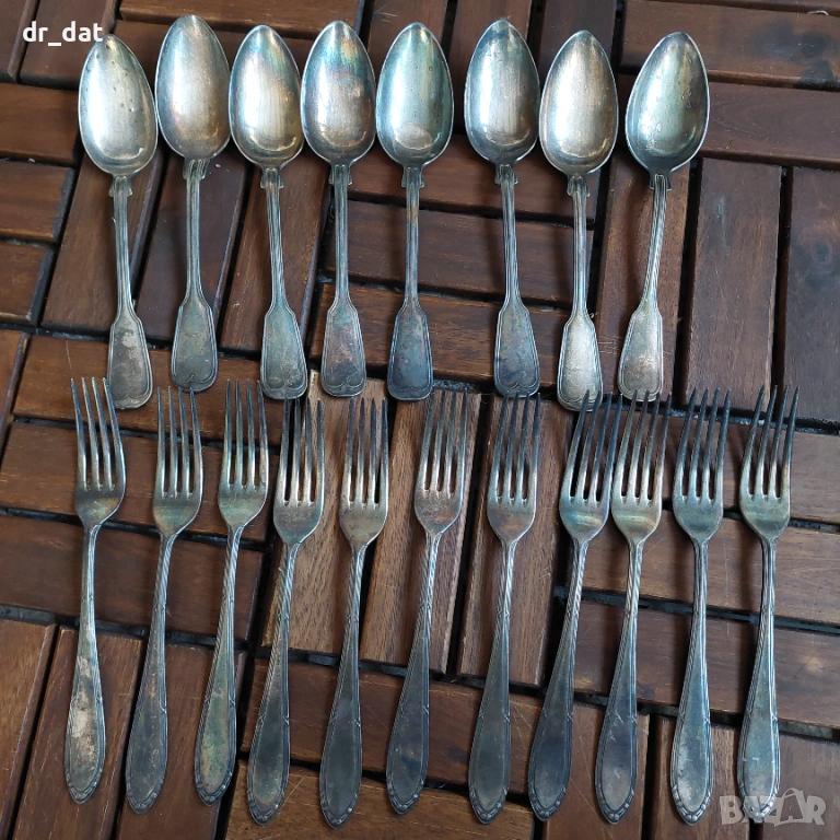 посребрени прибори - 90 микрона. В състоянието в което са - най-вече като бройка. Ножовете и вилиците са по 11 бройки, а лъжиците са 8. Най-вероятно са немски