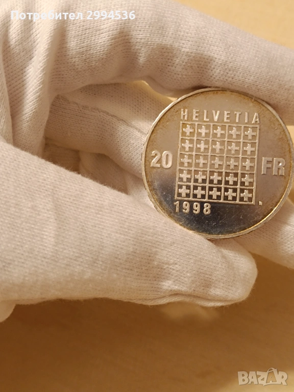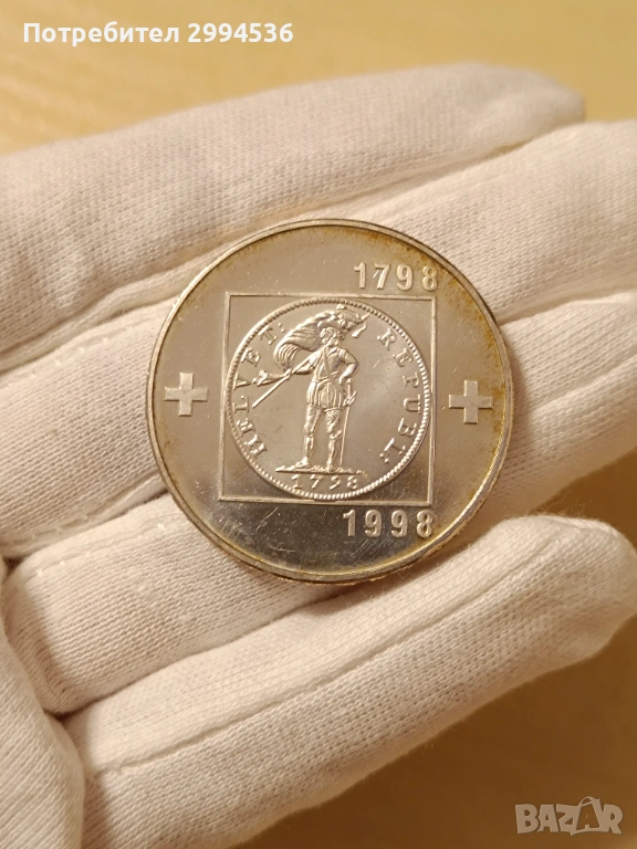 Възпоменателна монета от 20 швейцарски франка, издадена през 1998 г. в чест на 200-годишнината от основаването на Хелветската република. Сребро 0.835-20гр.
