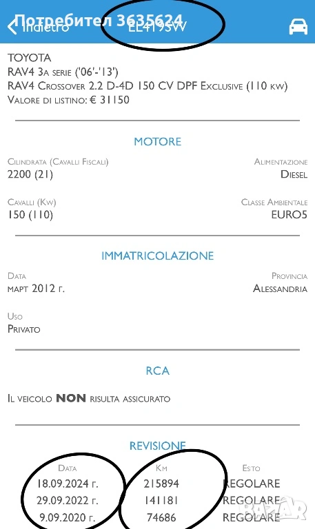 ОБЪРНЕТЕ ВНИМАНИЕ И НА ПОКАЗАНИЯТА НА КИЛОМЕТРАЖА ПРИ ТЕХНИЧЕСКИТЕ ПРЕГЛЕДИ ЗА ПОСЛЕДНИТЕ 6г. - ОТ 09. 09. 2020г. НАСАМ ! ПОСЛЕДЕН ТЕХНИЧЕСКИ ПРЕГЛЕД - НА 18. 09. 2024г. , КОГАТО АВТОМОБИЛЪТ Е БИЛ НА 215 894 км.