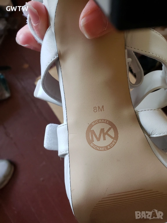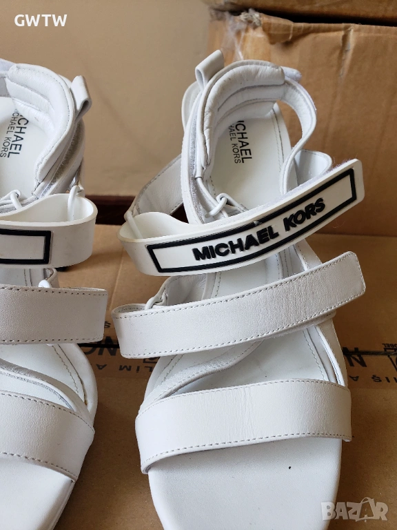Michael Kors Demi Leather Sandal, естествена кожа. Нови. Не са носени, само са пробвани. Уникален модел. Ток 9см., отпред лека платформа 2см. Малка чертичка на единия ток - не е увредена кожата, само има леко оцветяване - незабележимо е.