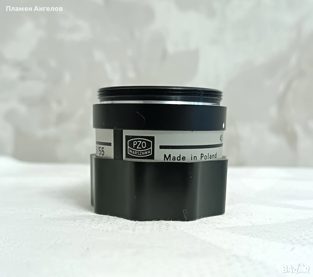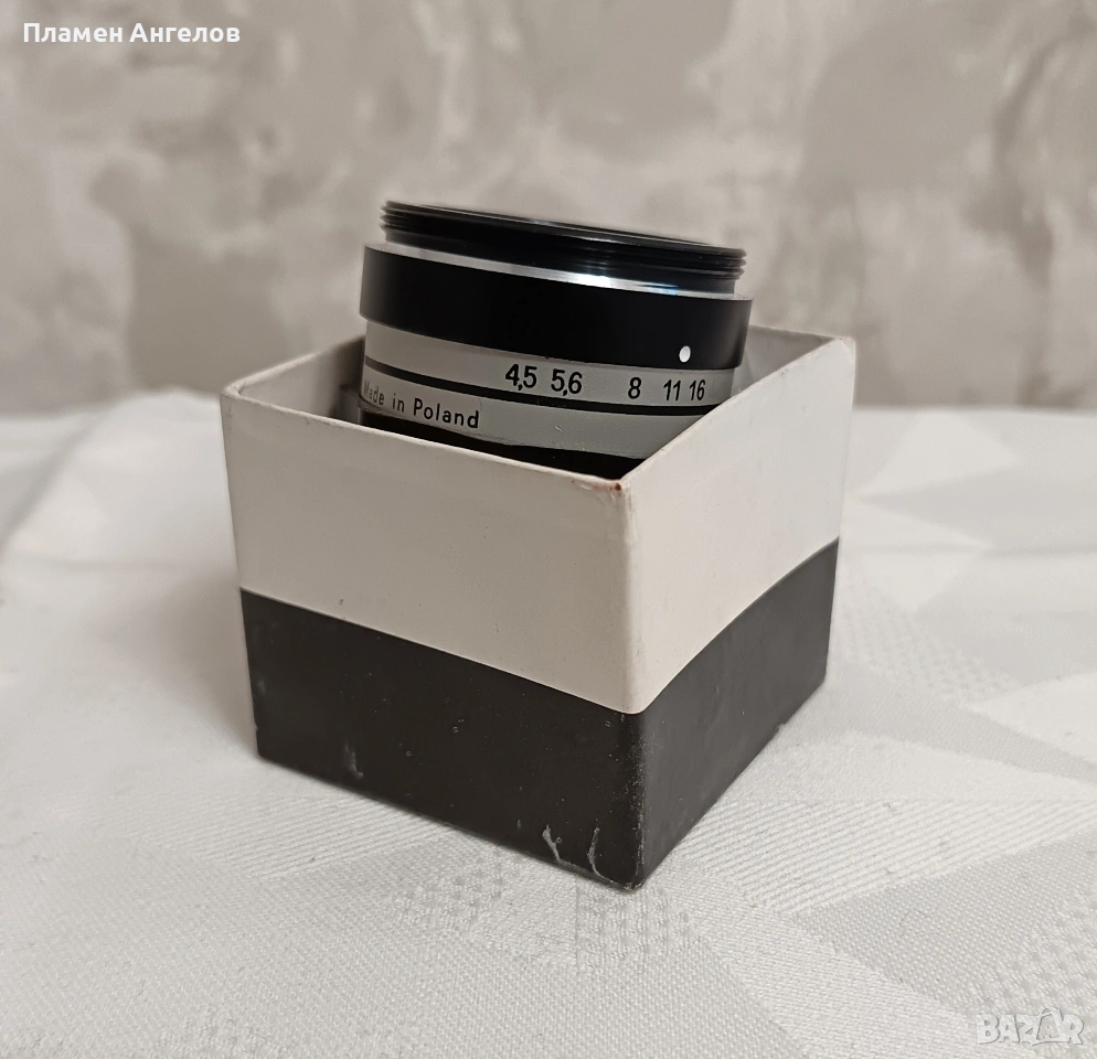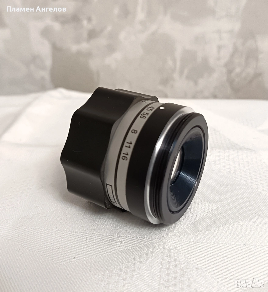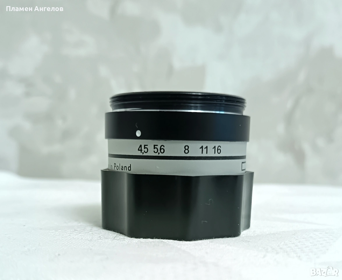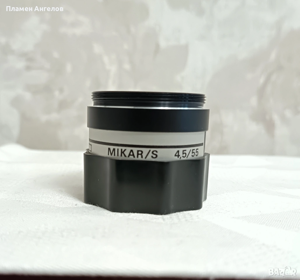 Винтидж, ретро полски обектив Mikar/S 4.5 /5.5 произведен от PZO(Polskie Zaktady Optyczne) Обективът е в отлично състояние. Фокусно разстояние 5.5мм.Светлина f/4.5.Диафрагма:Ръчна 5ламела-работи глатко. Чисти лещи, без драскотинки, Без гъбички. Корпусът е запазен. Предназначен за фотоувеличител "Krokus". Макро фотография с цифрови фотоапарати. Дава специфично"ретро" рисуване и добро боке. При завъртане се чува характерното щракане. Равномерен шестоъгълник. Няма прах м/у лещите.