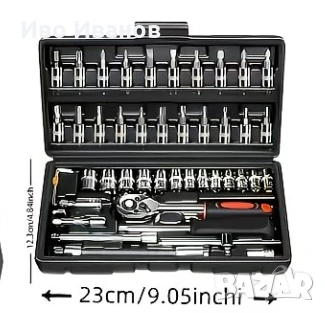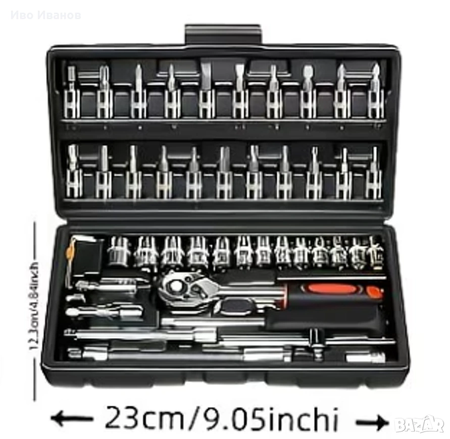 здрава кутия с размери 23 × 12 cm, което го прави лесен за пренасяне и съхранение. Гайкови ключове, 1/2” 1/4” 3/8” SAE и метрични . Комплектът включва: Разнообразни битове за