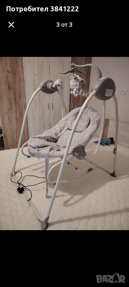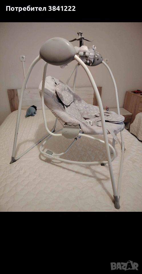 Люлката е страхотна вършеше ни страхотна работа. Всичко работи. Има си вградена музика както и usb изход. Пет степени на люлеене. Три позиции на гръбчето. Има дистанционно от което може да я регулирате от разстояние. Към онея също така има масичка за игра която просто не е снимана бях я махнала. Преобразува се на шезлонг който като се застопори може да се използва и като столче за хранене.