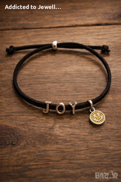 Нежна ръчно изработена гривна със сребърни букви JOY (радост) и сребърен smiley charm от Pandora.