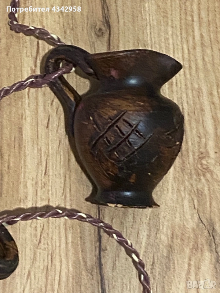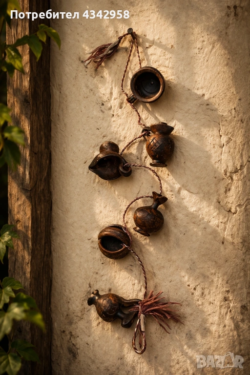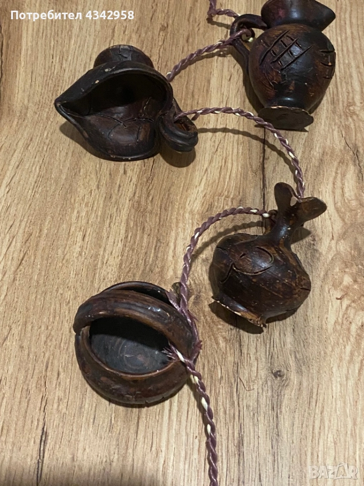 Оригинална винтажна висяща декорация, изработена от миниатюрни керамични съдове – кани, купички и декоративна фигурка, свързани с усукан шнур.