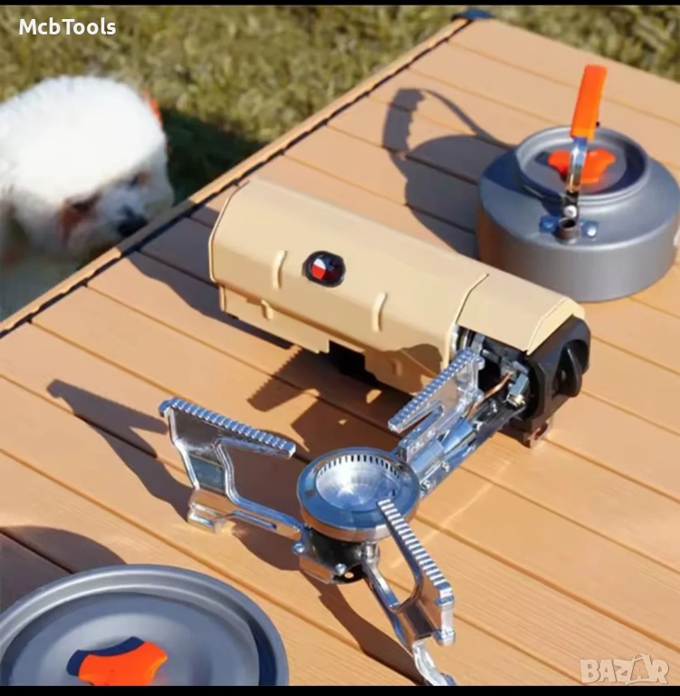 - Дизайн: Моделът е със сгъваем механизъм, който позволява горелката и крачетата да се прибират в тялото на котлона, което го прави изключително компактен за пренасяне.