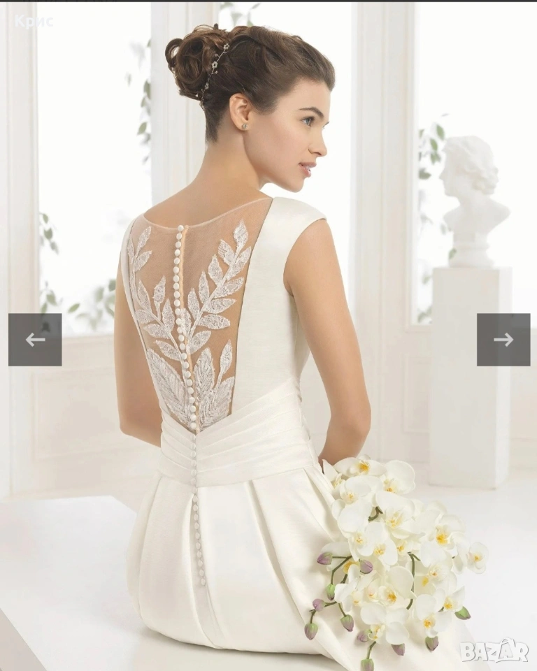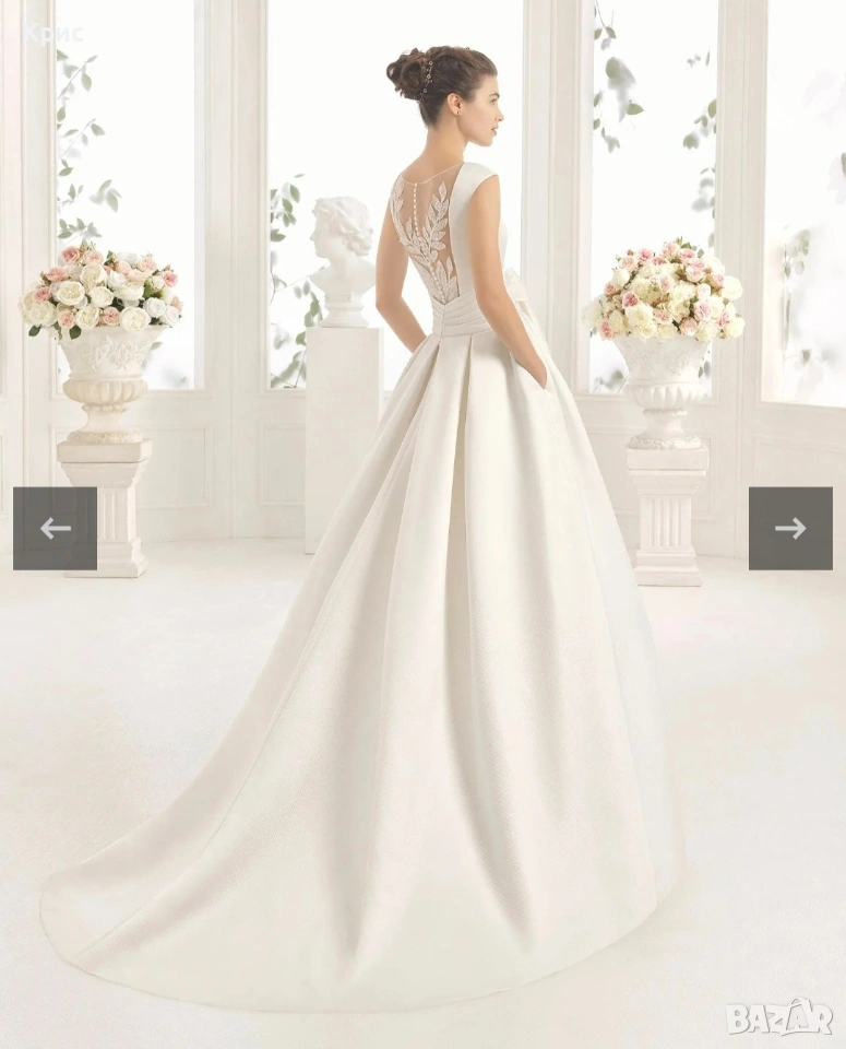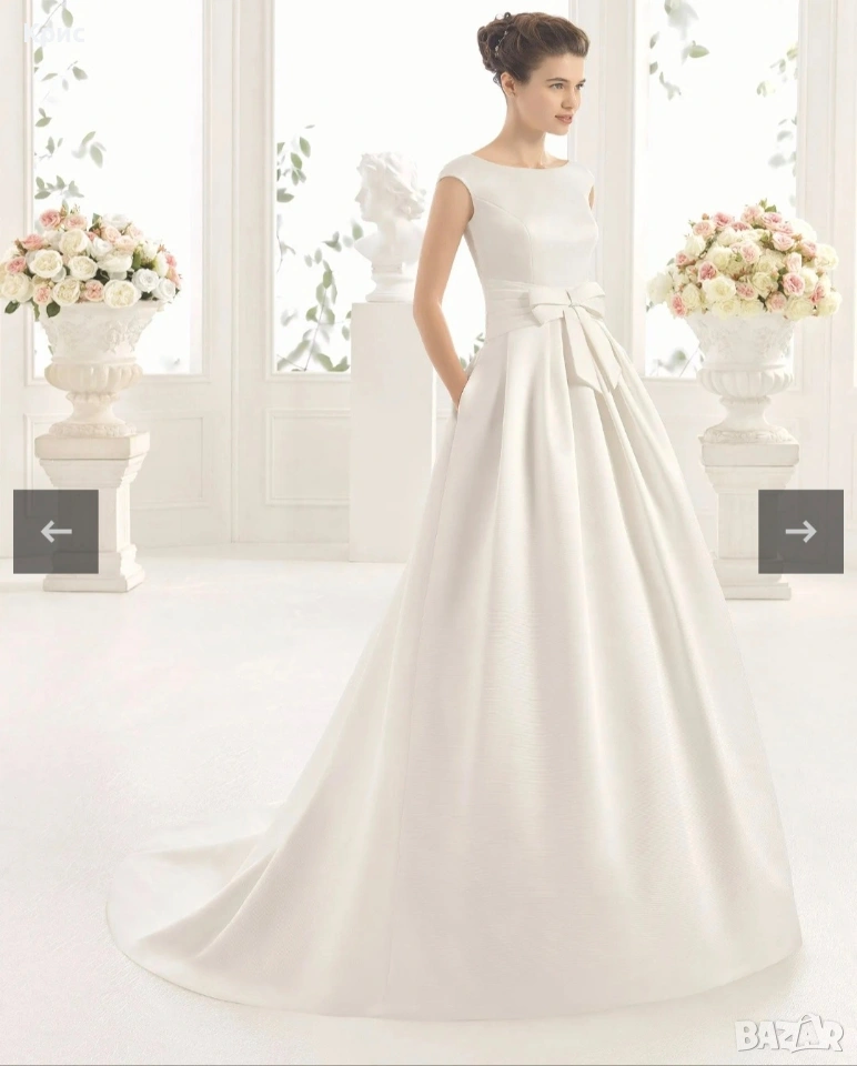 Продавам чисто нова дизайнерска сватбена булчинска рокля на испанската марка Aire Barcelona закупена от Milvana Moments в размер С-М. Роклята е от страхотен бял сатен с джобовете за ръцете . Не е обличана прана и така нататък. Чисто нова. Закупена е от бутика на Милвана в София за сумата от 4000 лв преди 1 месец , но тъй като в последствие взех друга , няма да мога да нося и двете . Размерът й е между 38 и 40 седи невероятно и много нежно и красиво оформя талията , огромна с много платове , а е лека като перце , усещането е все едно си с пижама , толкова е лека за носене. Шлейфът е дълъг , има кукичка с който се закача отзад , за да може да се танцува без да се настъпва. Не е стеснявана или разширявана , но е коригирана дължината , за да не се настъпва. Аз съм висока 174 см , тежа 54 кг и роклята ми е перфектна , бях с обувки с ток 5 см и е скъсена по тази дългжина , но който иска може да си я скъси още , за София , предлагам проба разбира се . Моделът е Ceres , на модния дизайнер Aire Barcelona. А- силует