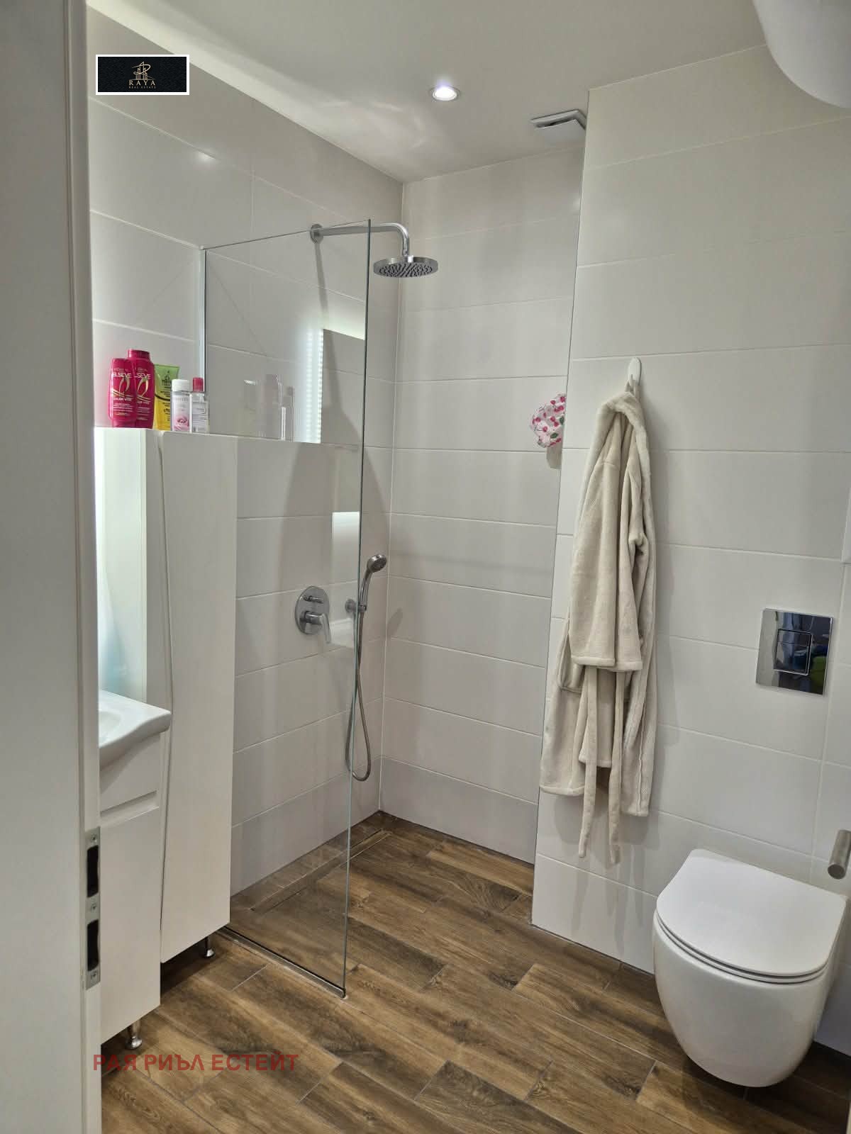 - Баня с тоалетна: под гранитогрес; стени фаянс; оборудвана с мивка с батерия, шкаф, тоалетна, обособен душ със стъклена преграда и бойлер.