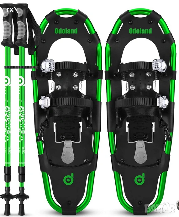 висококачествен комплект за зимни преходи – алуминиеви снегоходки Odoland (размер 25 инча) в комплект с регулируеми телескопични щеки. Снегоходките са изключително леки и здрави, проектирани да осигурят максимална стабилност и плаваемост в дълбок сняг.