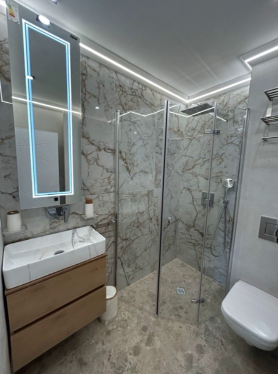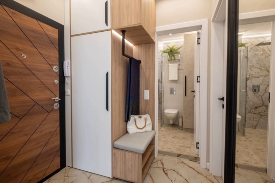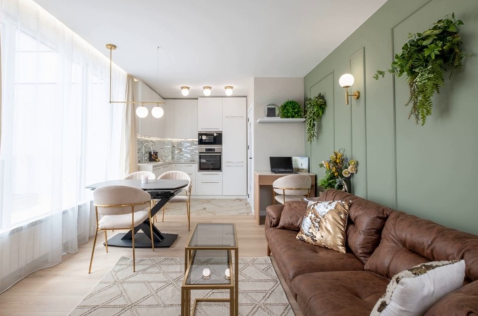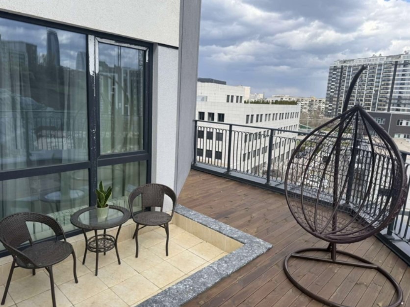 Имотът е обзаведен, с площ 75 кв.м, на 5-ти от 8 етажа в сграда с асансьор. Разпределението включва входно антре, дневна с кухня и трапезария, спалня, баня с тоалетна и тераса.